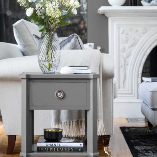 Henshaw sidebord/nattbord med en skuff i lys koksgrå.