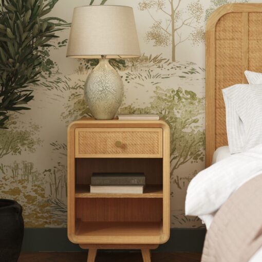Millen, retro nattbord i eik/eikefiner med flettet rotting