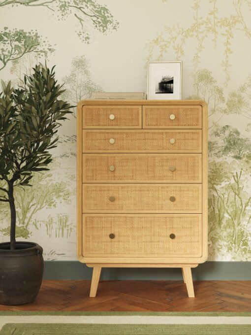 Millen, høy retro kommode i eik/eikefiner med flettet rotting