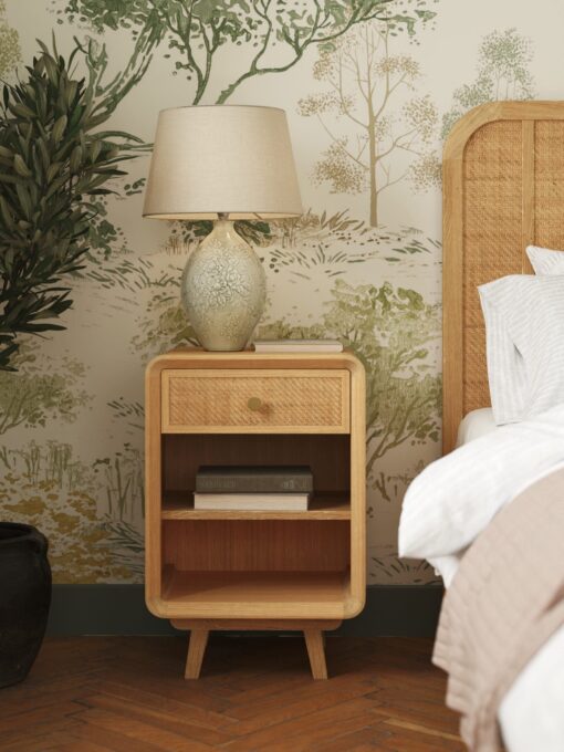 Millen, retro nattbord i eik/eikefiner med flettet rotting