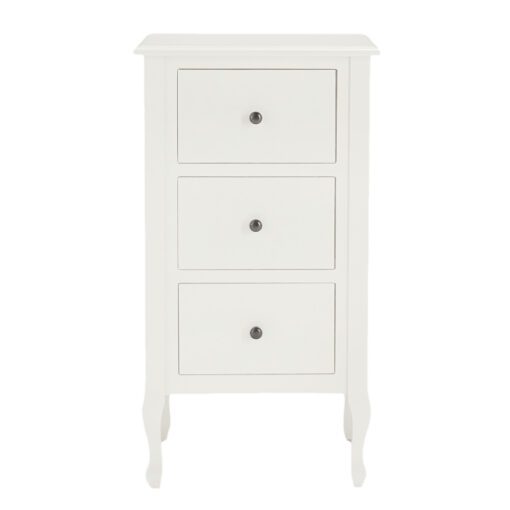 Rosalind, liten romantisk kommode med tre skuffer i bomullshvitt
