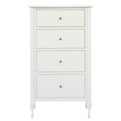 Rosalind, høy romantisk kommode med fire skuffer i bomullshvitt