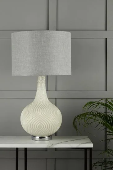 Grace, stor bordlampe i hvitt glass/grå skjerm (H77cm)
