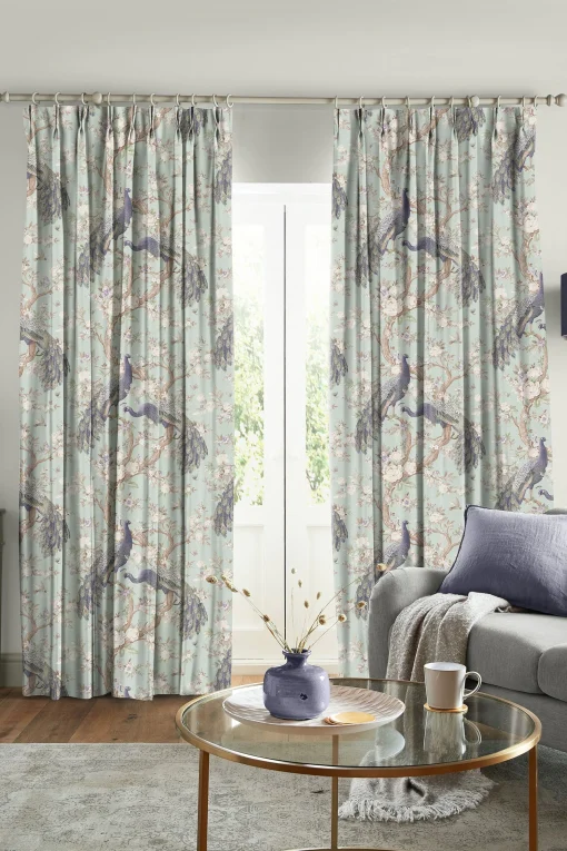 Gardinstoff, Belvedere, påfugler i duck egg