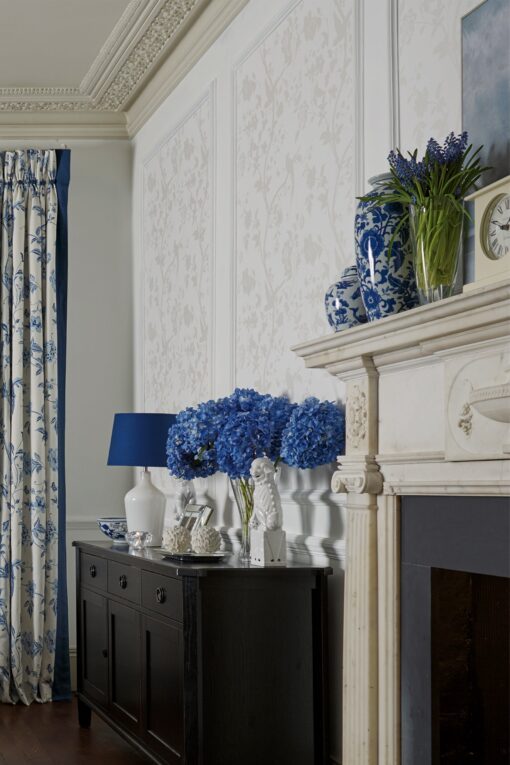Oriental Garden, tapet med fugler i hvitt og perlemor