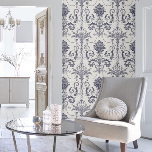 Josette, damaskmønstret tapet midnattsblå på hvit bunn