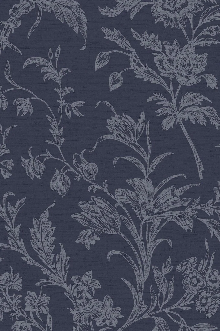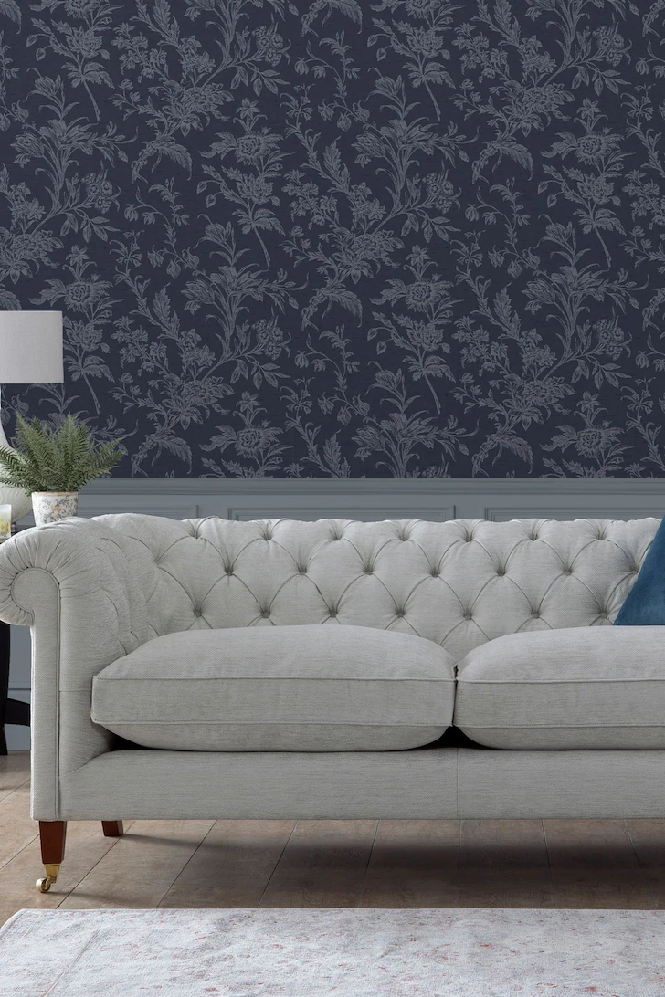 Midnight Seaspray Lloyd-trykket er tidløst elegant og er en storstilt vevd floral jacquard-design med romantisk buede blomsterstengler av tulipaner, primulaer og potentillaer.