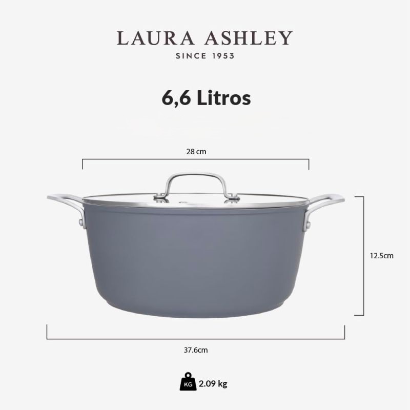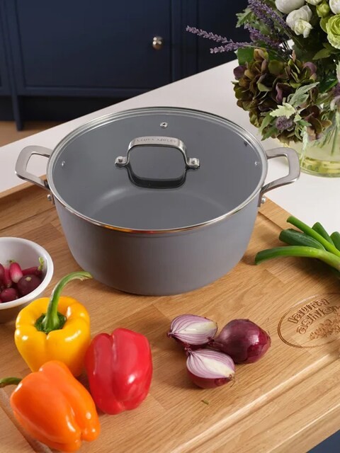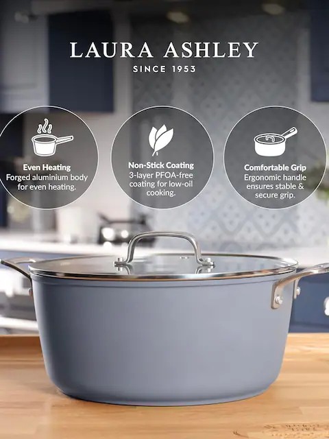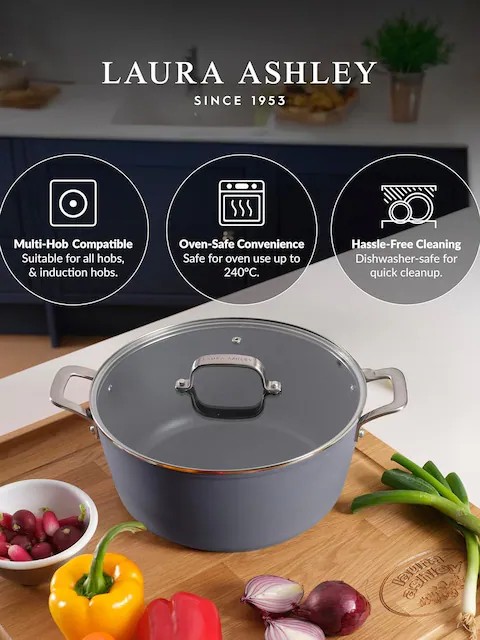 Denne romslige 6,6 liters gryten fra Laura Ashley kombinerer stor kapasitet med et stilrent og moderne uttrykk. Den slitesterke non stick-belegningen sørger for jevn varmefordeling og gjør både matlaging og rengjøring enkel – selv når du lager større porsjoner.