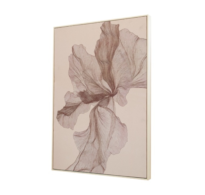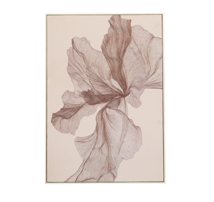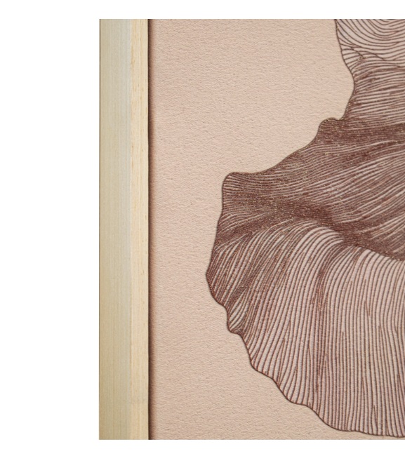 De delikate, rosa nyansene kombinert med det flytende, organiske designet skaper et rolig og elegant uttrykk. Den lyse fururammen tilfører en varm og naturlig innramming som harmonerer vakkert med motivets dempede palett.