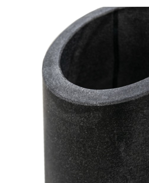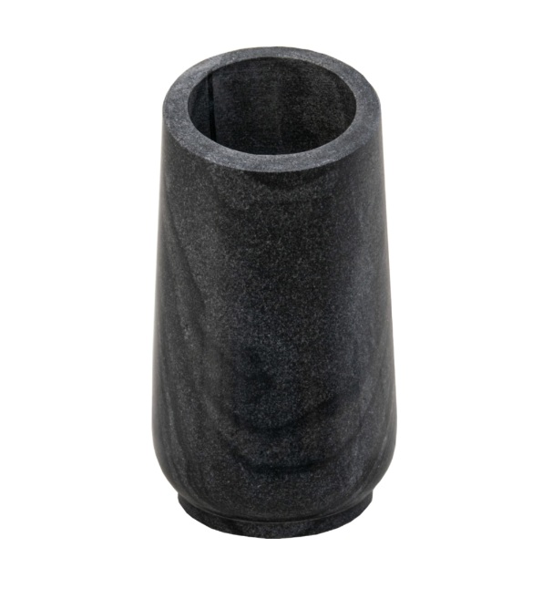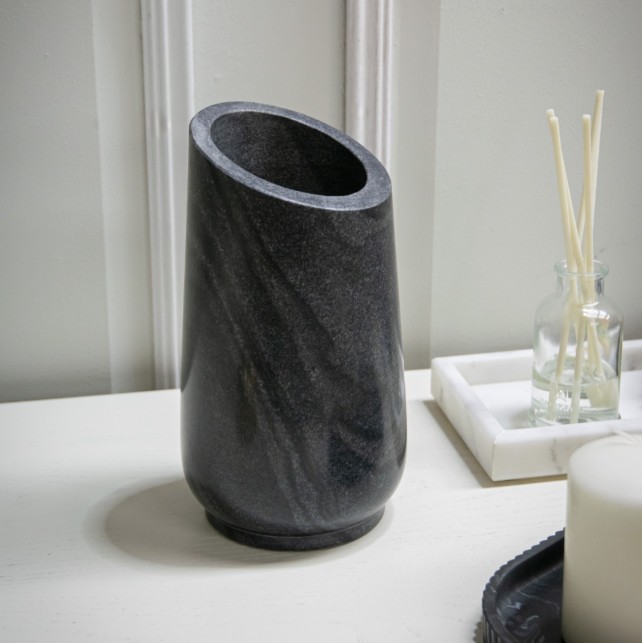Den karakteristiske skråskårne toppen gir vasen et moderne uttrykk og skaper en spennende kontrast til den klassiske, kompakte silhuetten. Den glatte, polerte overflaten fremhever marmorenes naturlige struktur og gir et subtilt lysspill som understreker materialets luksuriøse kvalitet. Hver sort marmorvase har unike variasjoner i steinens åremønster, noe som gjør hvert eksemplar helt spesielt.