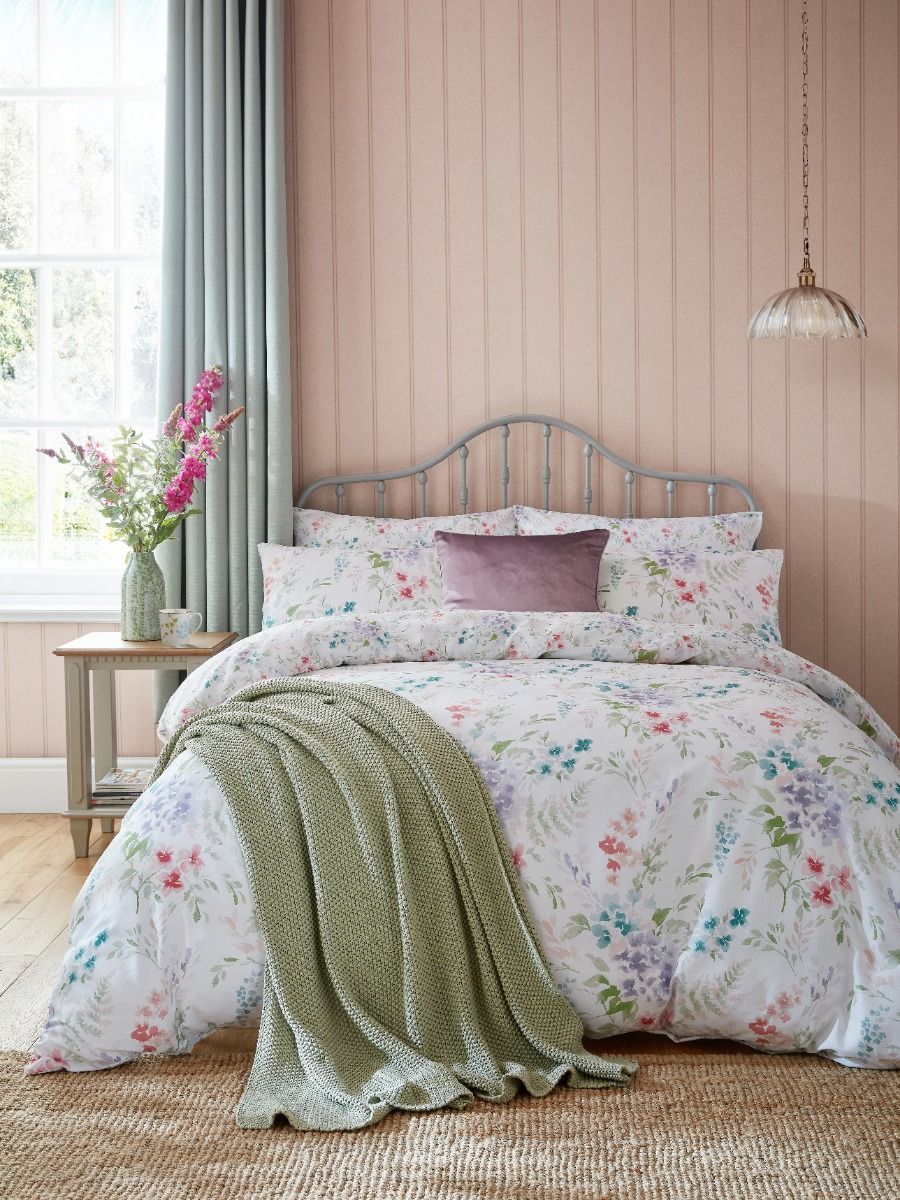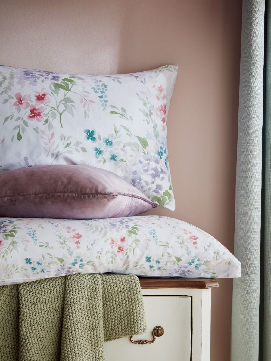 Det vårlige designet Aulden Flowers fra Laura Ashley, med hortensiaer i lavendel. Designet som en blomstrende hage, med blomster og grønt, for en vårlig pust til soverommet. Dettee blomstrete sengesettet vil tilføre mønster og farge til soverommet, og de er reversible, så du får 2 i 1.