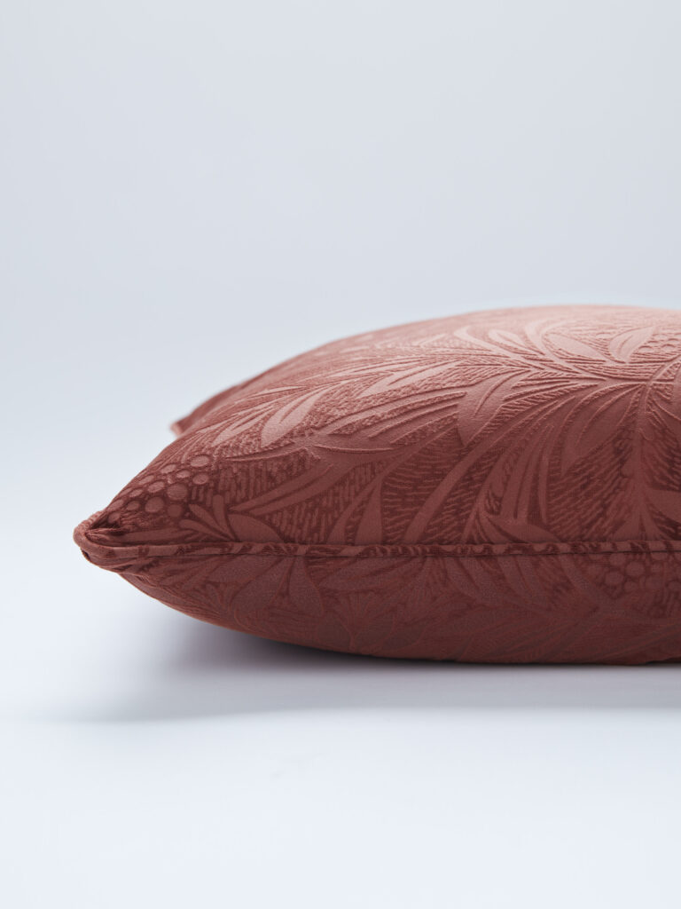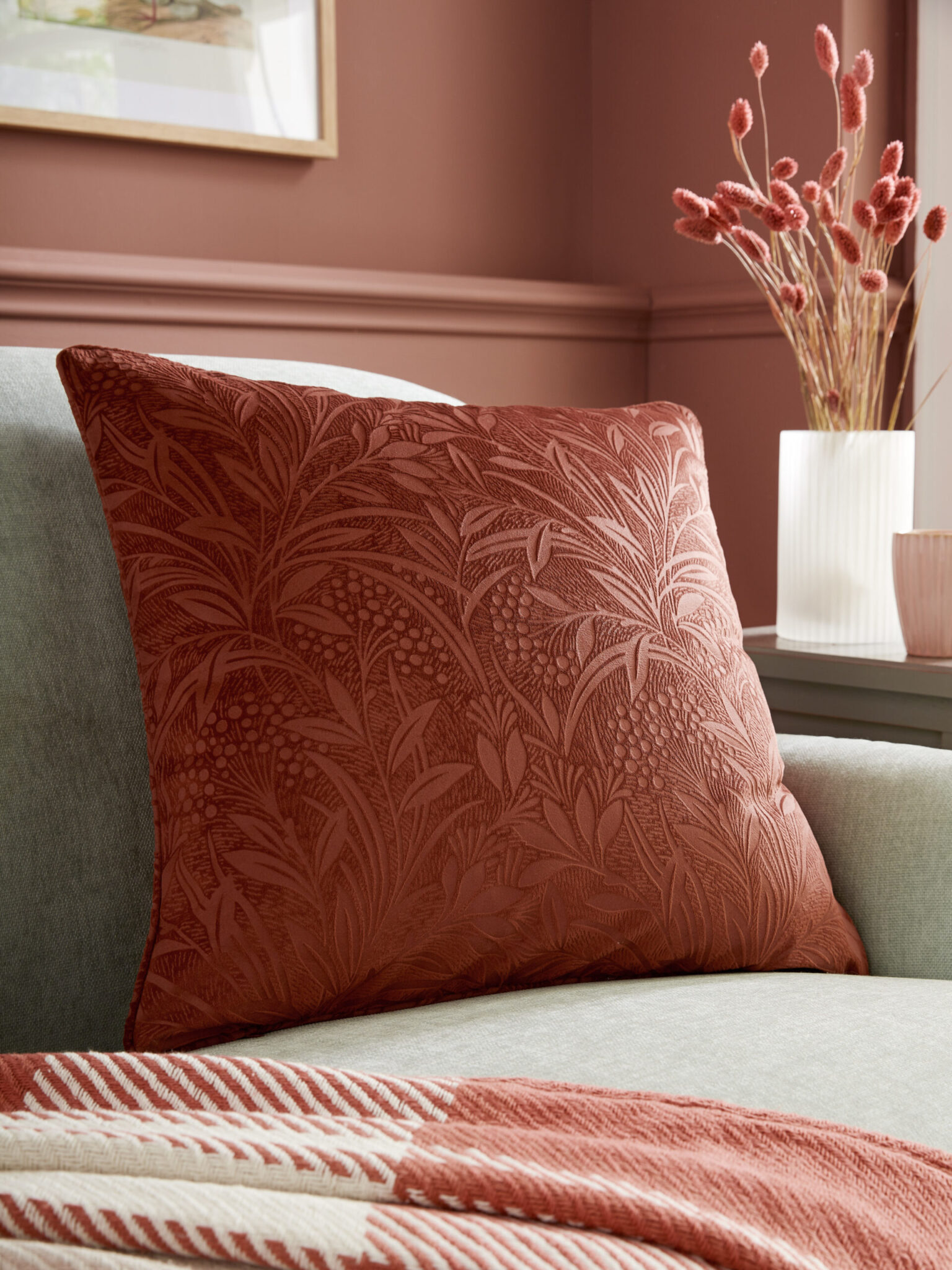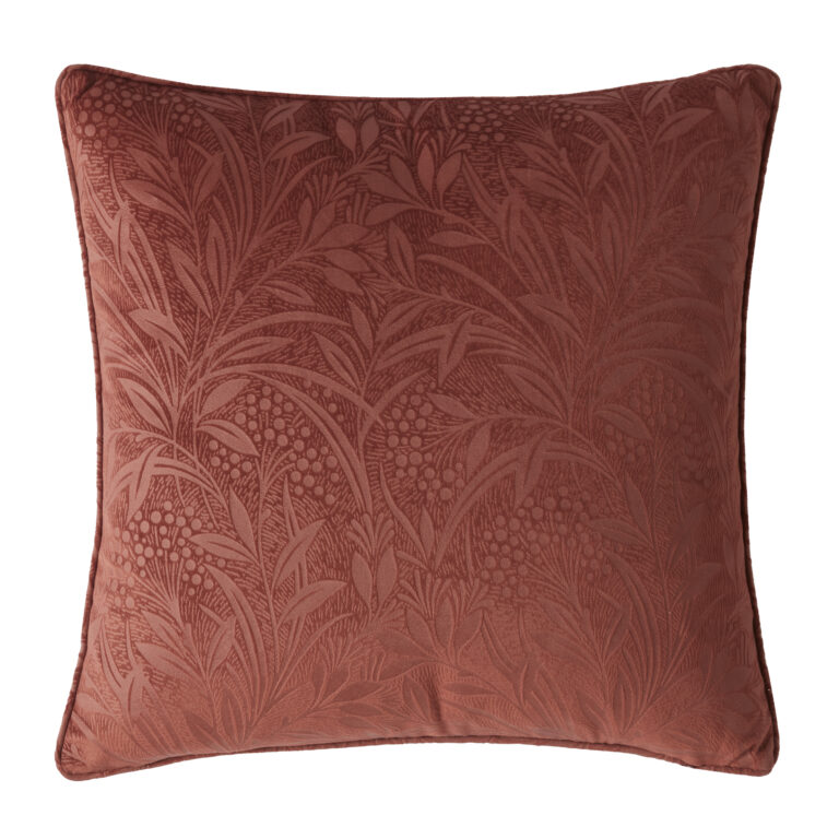 Barley, et elegant og vakkert pute i terrakotta orange fløyel fra Laura Ashley. Det delikate mønsteret med knopper og blader på en myk fløyel gir et subtilt og eksklusivt uttrykk.