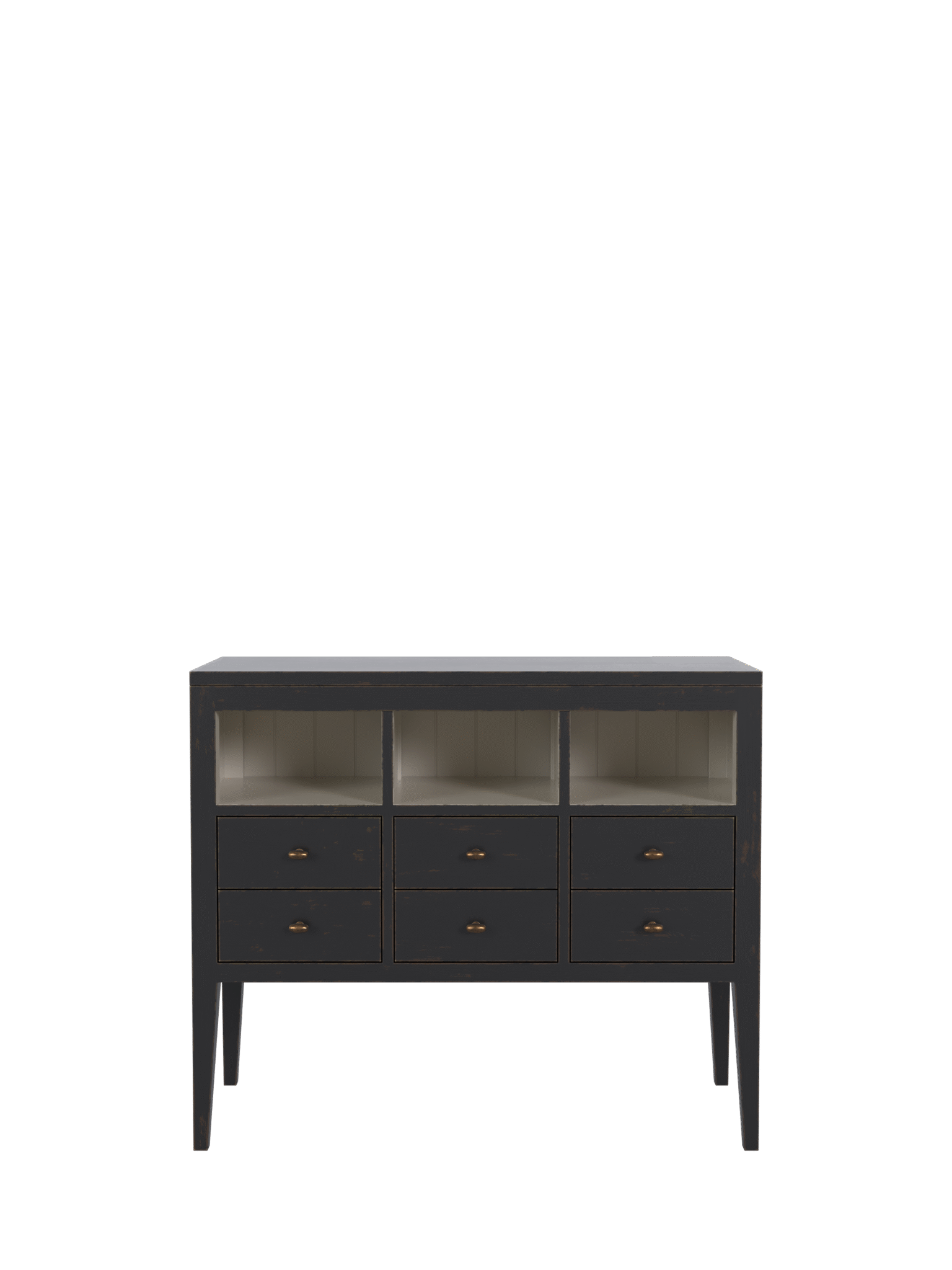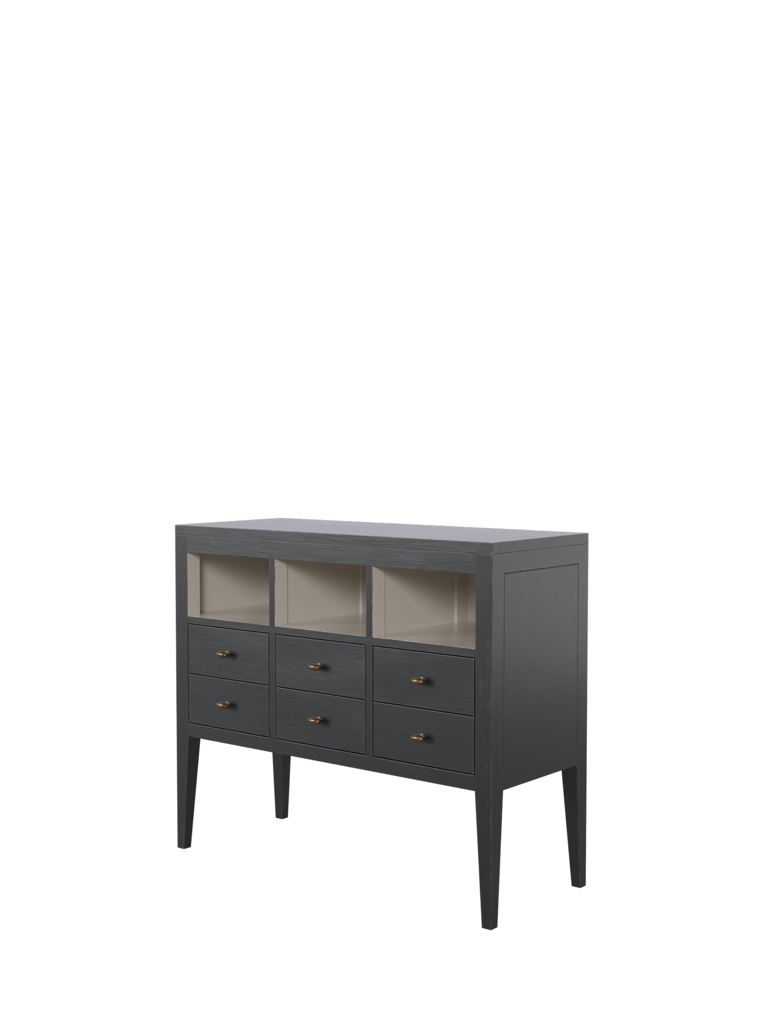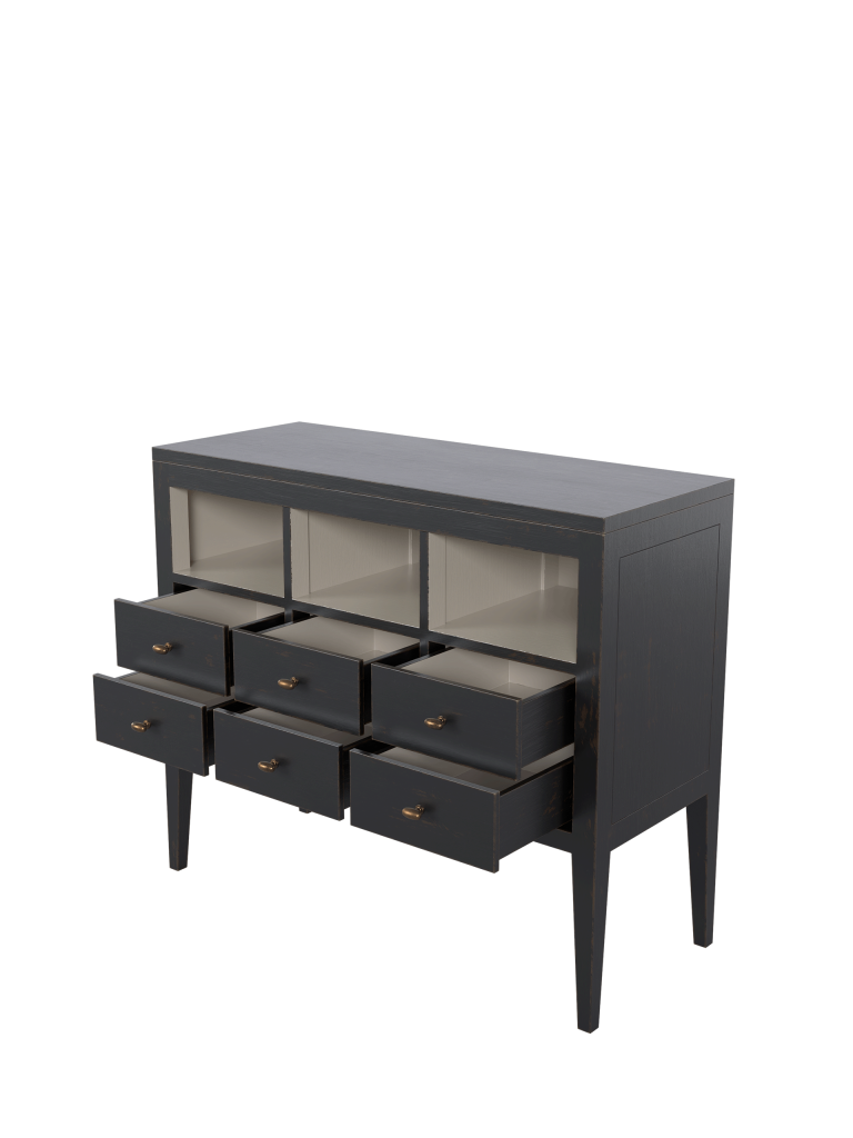 Det subtilt figurformede treverket er håndmalt utvendig i kullsort, før kanter og utvalgte flater håndbearbeides for å avdekke et brent umbra-underlag. Interiøret er behandlet i en myk naturfarge som skaper en elegant kontrast. Avslutningsvis er overflatene forseglet med en klar matt lakk som gir langvarig beskyttelse og en slitesterk finish.