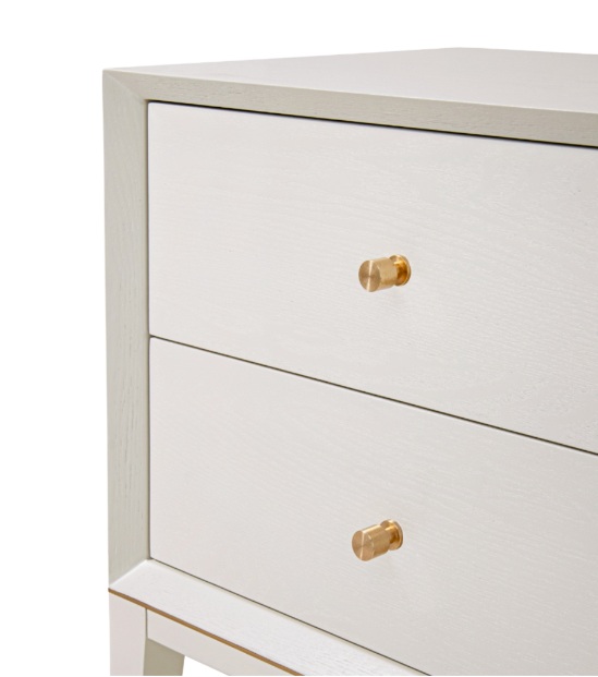 Dette sidebordet med 2 skuffer gir praktisk oppbevaring til soverommet, enten det brukes som nattbord ved siden av sengen eller som et stilfullt sidebord i stue og entré. Skuffene gir enkel tilgang til småting, samtidig som designet holder uttrykket ryddig og harmonisk.