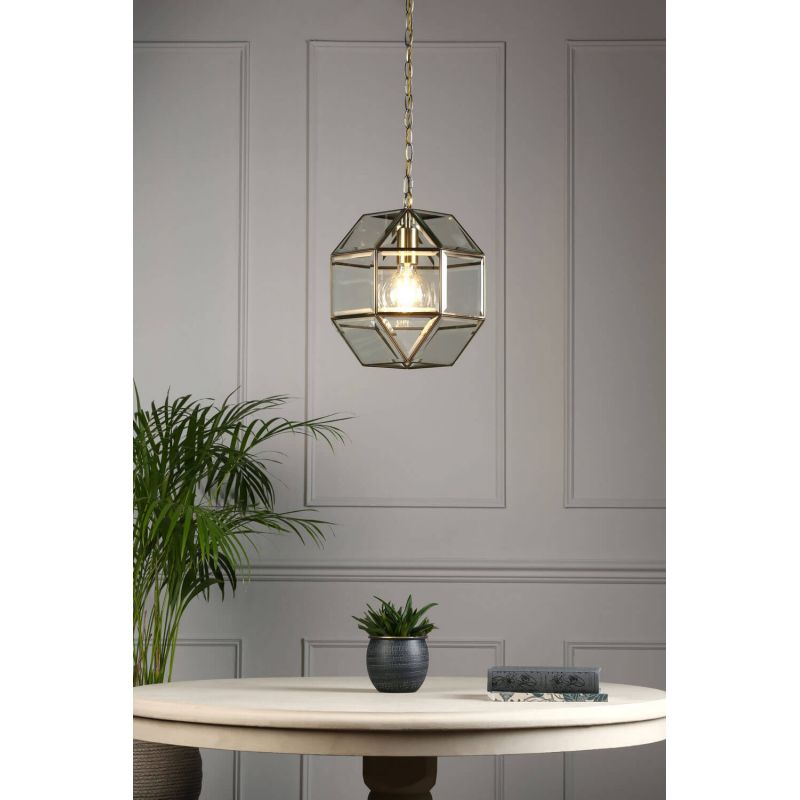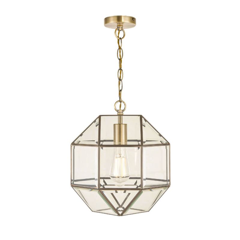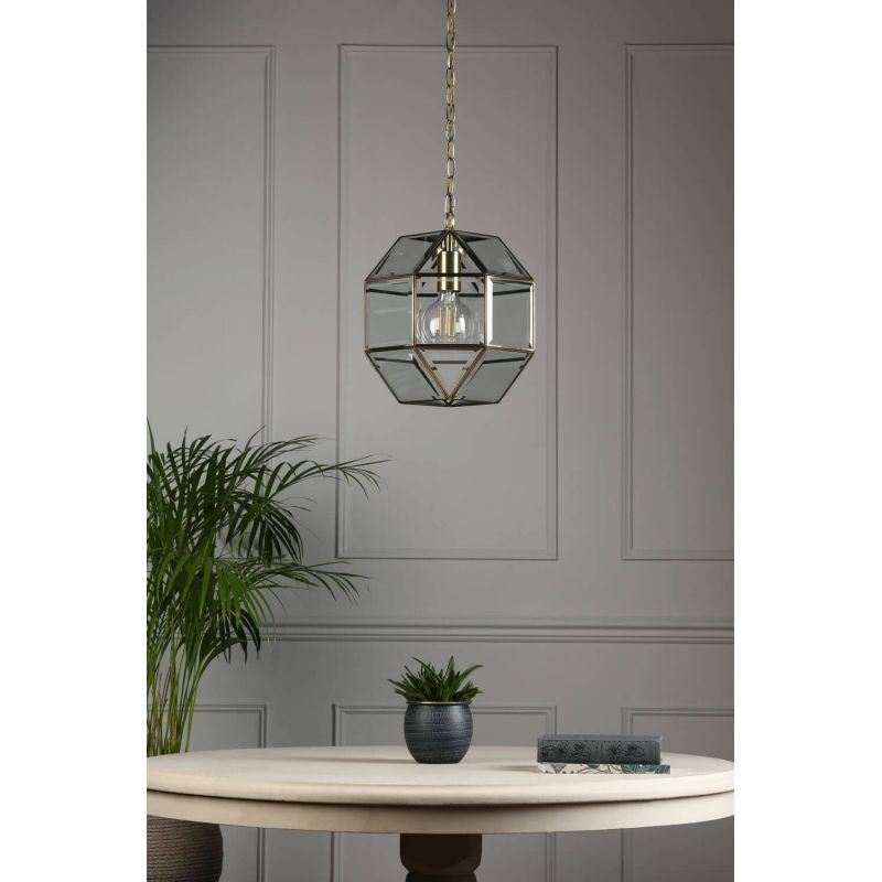 The Blackwell ceiling light comprises small panels of clear glass, the edges of which are encased in thin metal strip, with a warm, antique brass finish, forming a threedimensional roughly globe shape. The glass is bevelled for a luxurious, quality look.