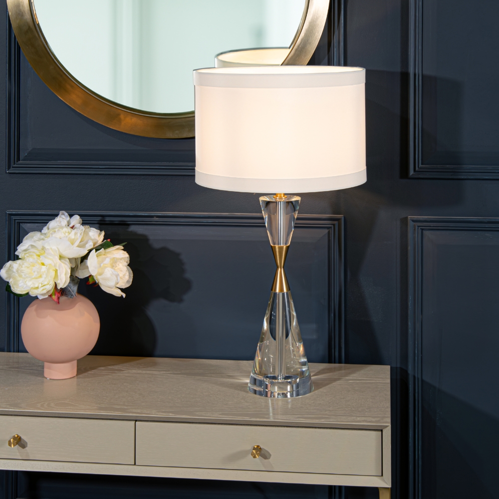 Cale bordlampe kombinerer moderne eleganse med tidløst formspråk, og tilfører interiøret et sofistikert og gjennomført uttrykk. Den vakre timeglassformede basen i krystall skaper et skulpturelt og raffinert blikkfang, elegant fremhevet av detaljer i antikk messing.
