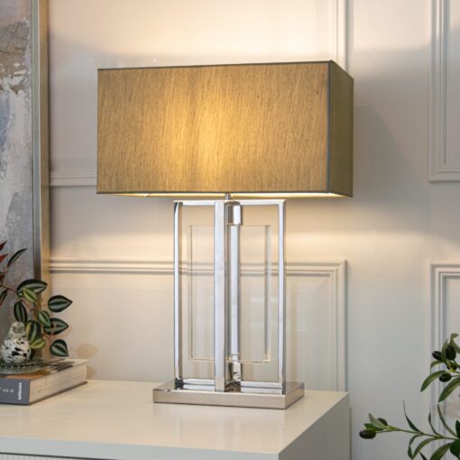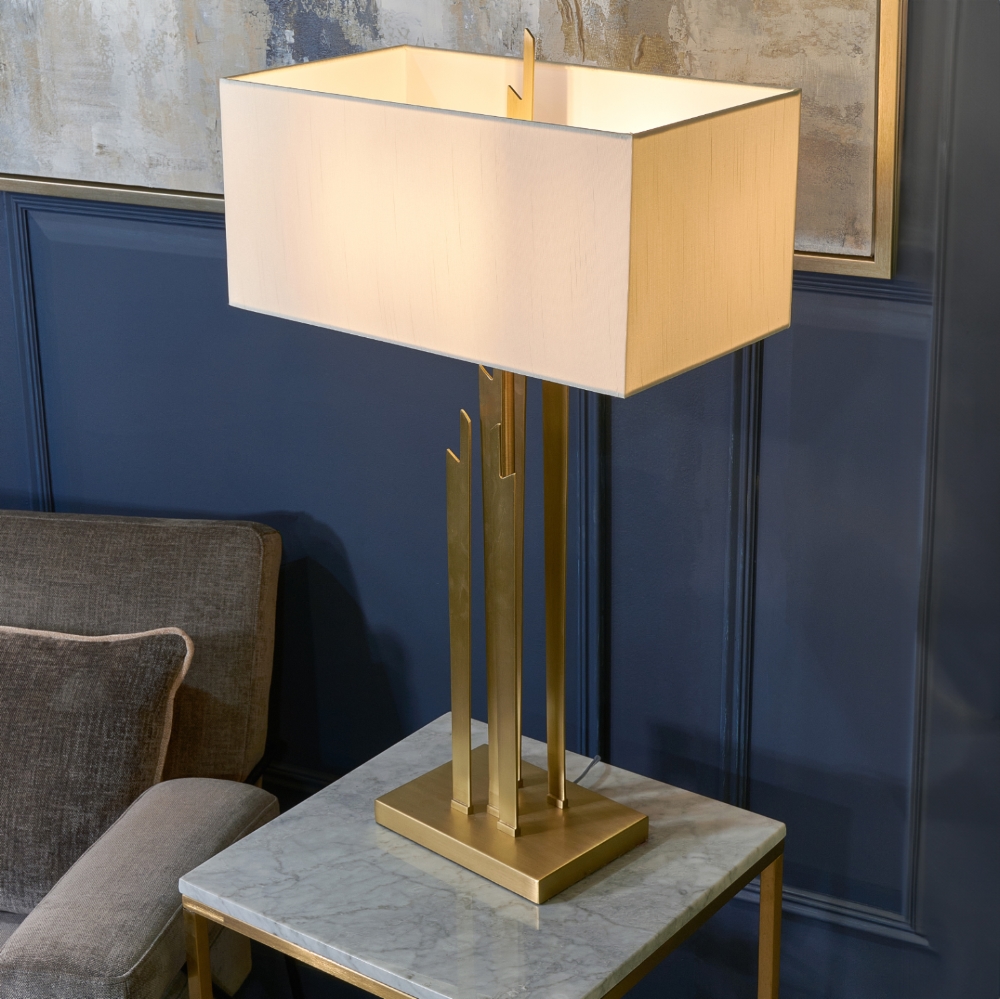Carrick bordlampe er inspirert av skyskraperne i New York og London, og kombinerer moderne arkitektonisk design med elegant håndverk. Lampen har en struktur i metall som stiger opp fra en solid metallbase, og den rektangulære lampeskjermen gir et raffinert og iøynefallende uttrykk.