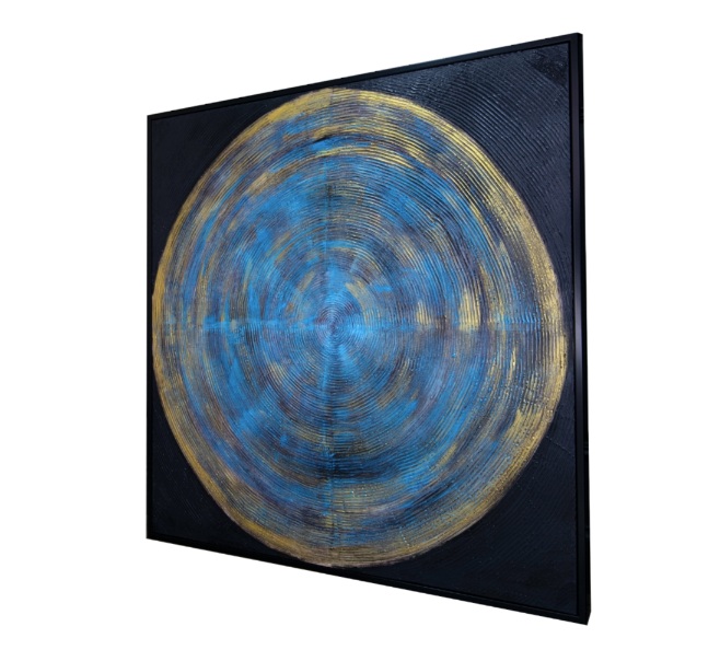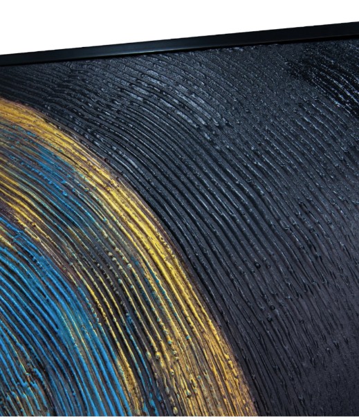 Clarice er et kraftfullt og uttrykksfullt abstrakt maleri som tilfører rommet dybde, energi og eksklusivitet. Mot en dyp sort bakgrunn trer en markant sirkel frem i blå og gulltoner. Konsentriske, teksturerte ringer stråler utover fra sentrum og skaper en dynamisk følelse av bevegelse og intensitet.