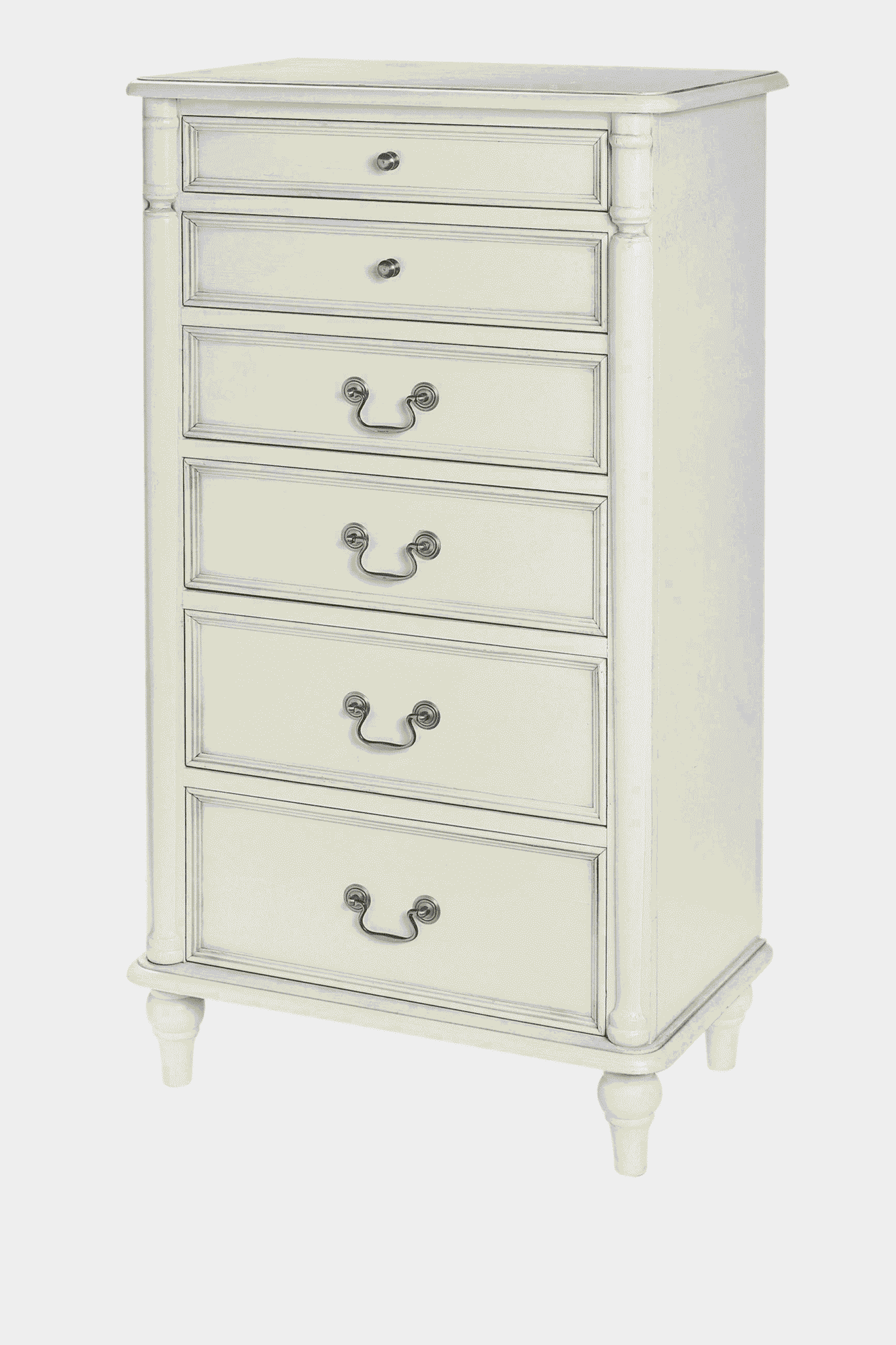 Clifton, en klassisk møbelserie, her med en høy kommode med seks skuffer i en lekker duegrå farge.