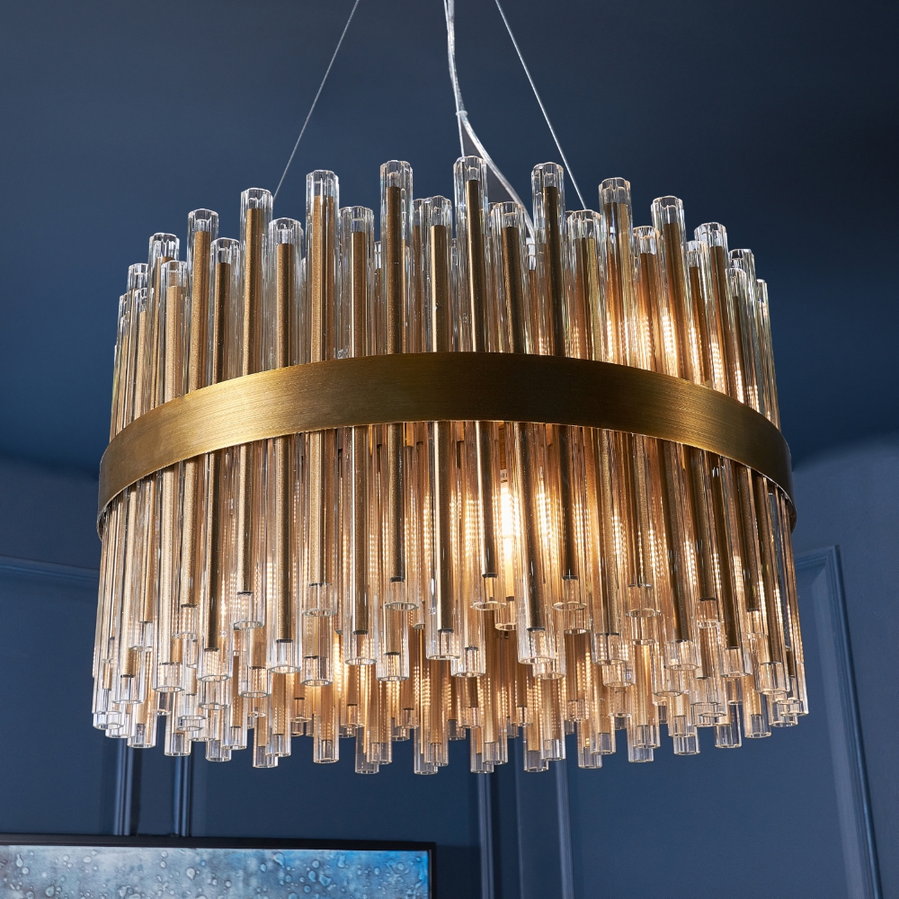 Colmar 60cm lysekrone er en sofistikert, mellomstor lysekrone fra vår kolleksjon, designet for å tilføre luksus og tekstur til ethvert interiør. Med alternerende glassstenger i to lengder skaper den en lagdelt effekt som sprer lyset vakkert.