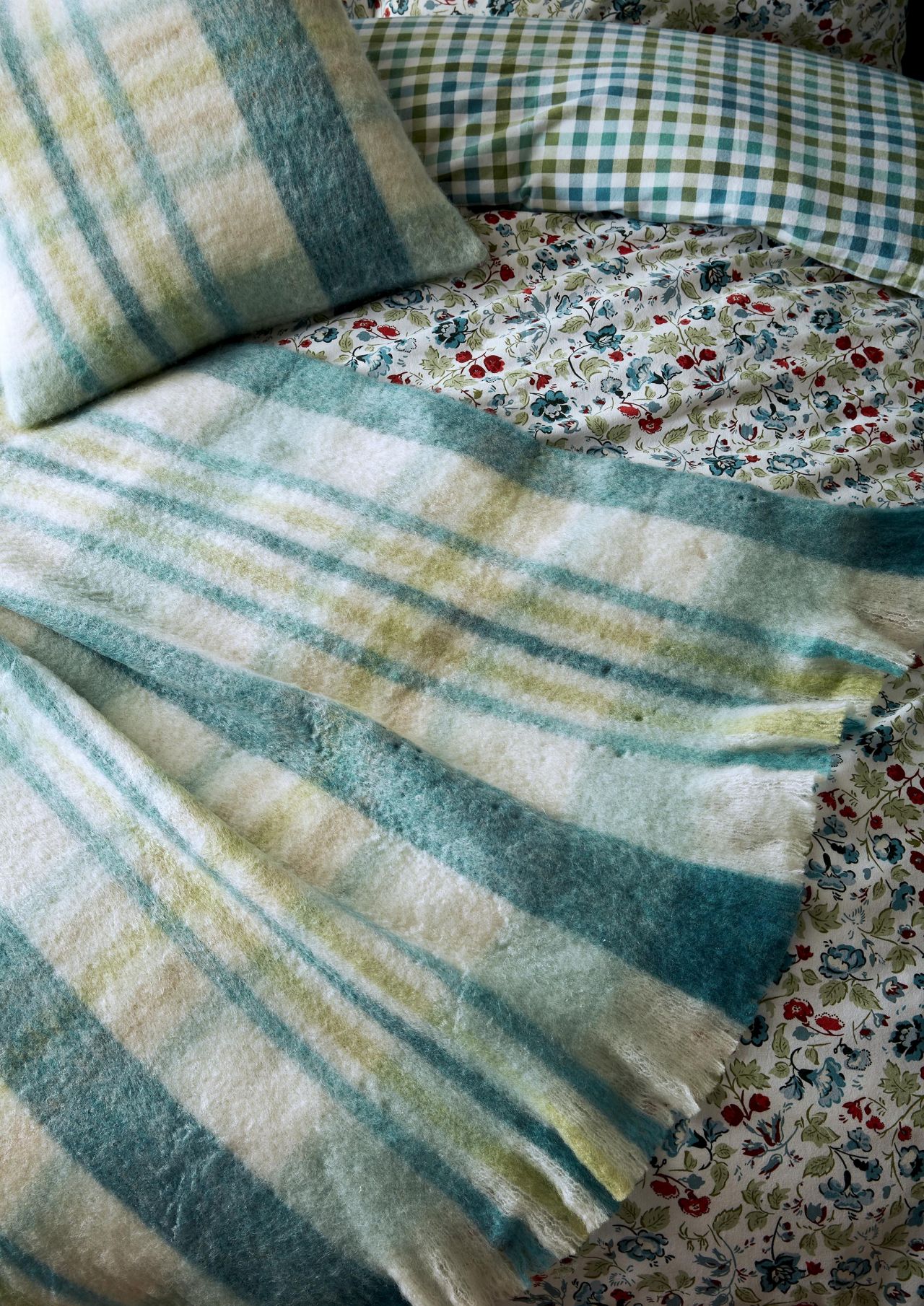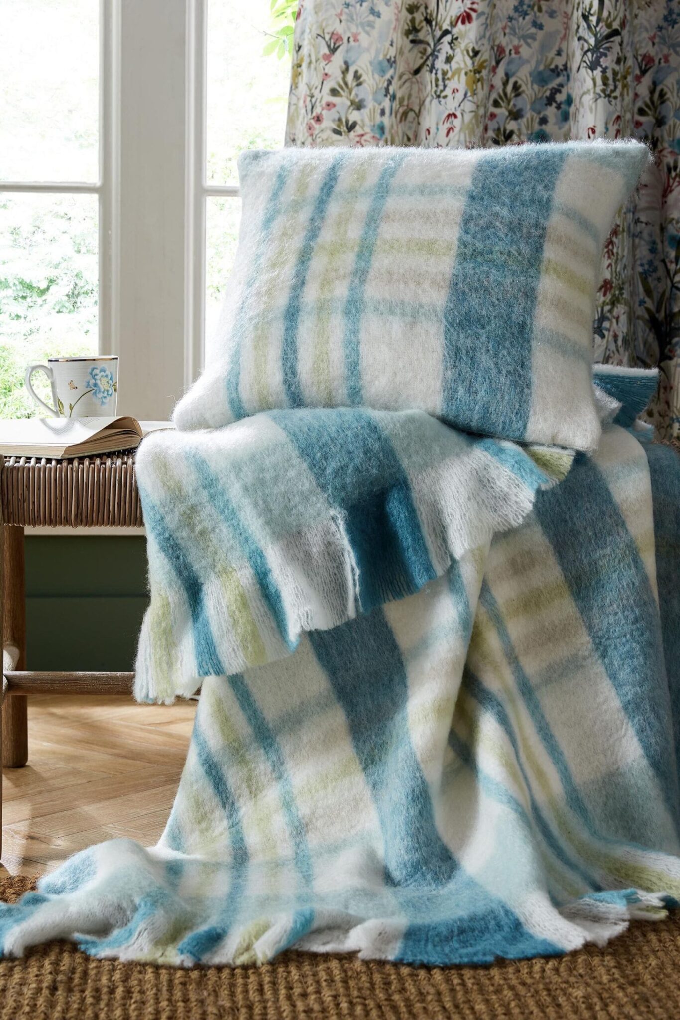 Colton, et mykt og delikat pledd i ullmiks, med bøstet overflate og lekkert rutemønster i blått, salviegrønt og kremfarget gir det et soft og elegant uttrykk. Et pledd som lett gir liv til sofa eller seng. Kombiner gjerne med Colton pute.
