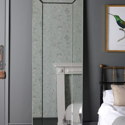 Dette speilet kan bare stilles i stående format. Ikke egnet for bad eller utendørs bruk. Designet som et skjevt speil, for sikkerhets skyld må det festes sikkert til veggen med kjeden som følger med; følg de medfølgende instruksjonene og bruk riktig feste for strukturen til veggen din.