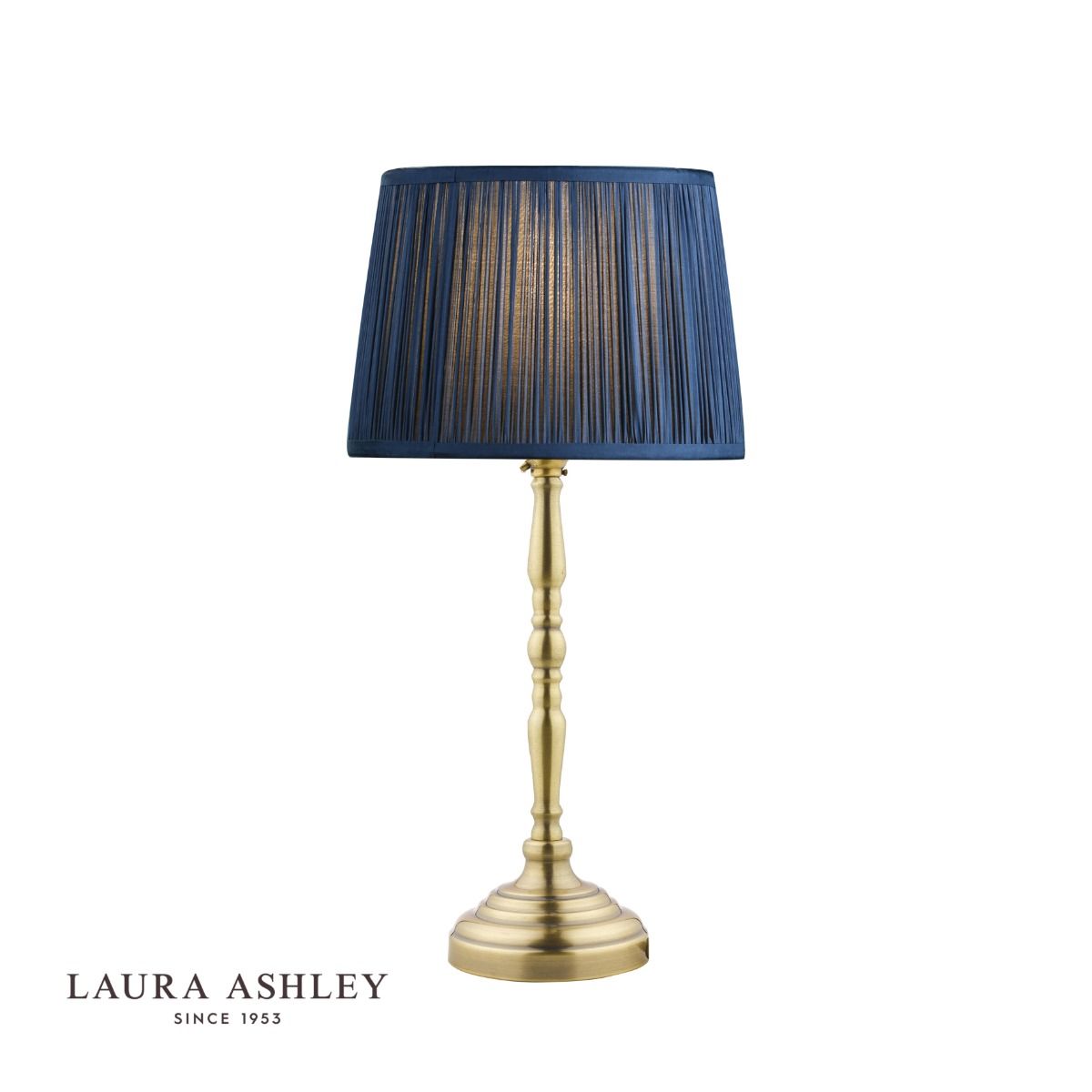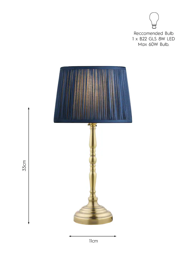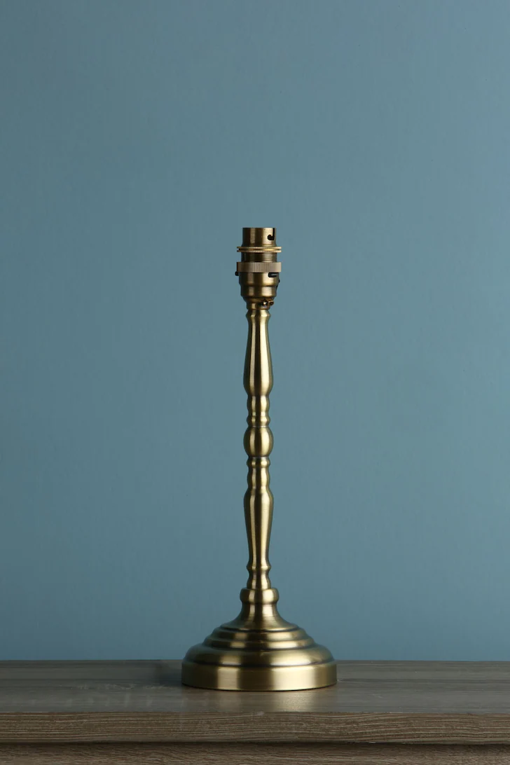 En klassisk lysestake bordlampe, Corey lampefot har en varm antikk messingfinish.