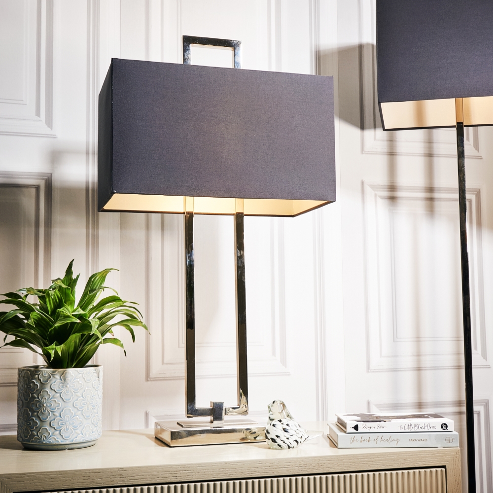 Danby bordlampe i polert nikkel kombinerer moderne eleganse med et tidløst uttrykk. Den stilrene metallbasen gir lampen en raffinert og slank silhuett, mens skjermen i gunmetal-farget stoff tilfører dybde og et eksklusivt preg til helheten.