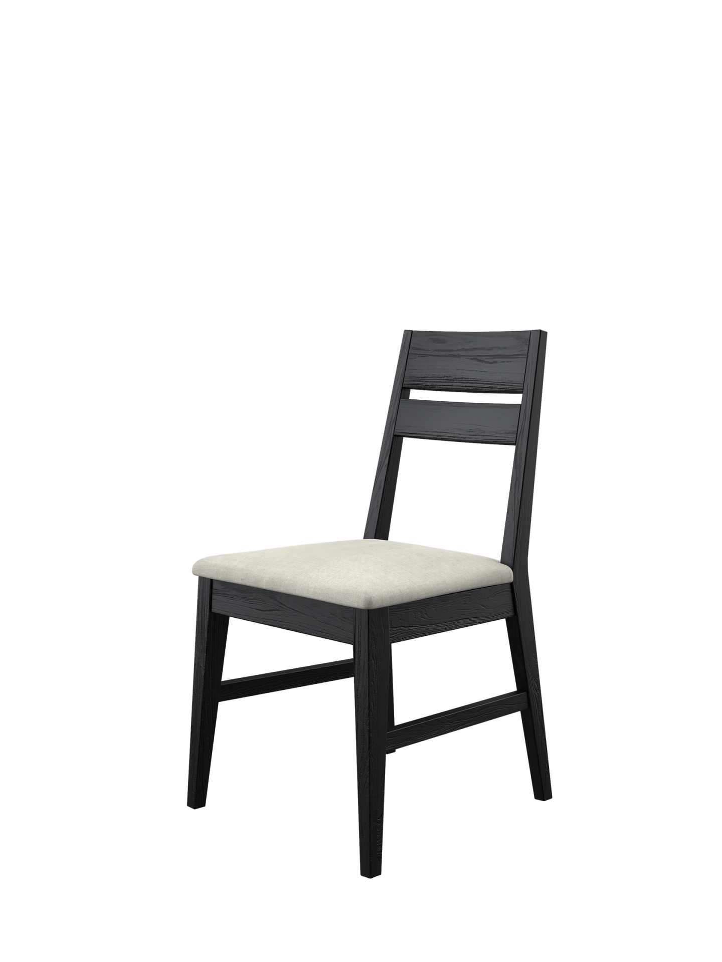 Med mykt avsmalnende ben, en ryggstøtte med stige og trekk i 100 % lin, kombinerer de klassisk design med moderne komfort. Stolene er laget av heltre alm, og de børstede overflatene fremhever treets naturlige struktur. Til slutt er stolene ferdigstilt med en rik svart maling og klar matt lakk, som gir langvarig beskyttelse og et tidløst, sofistikert uttrykk.