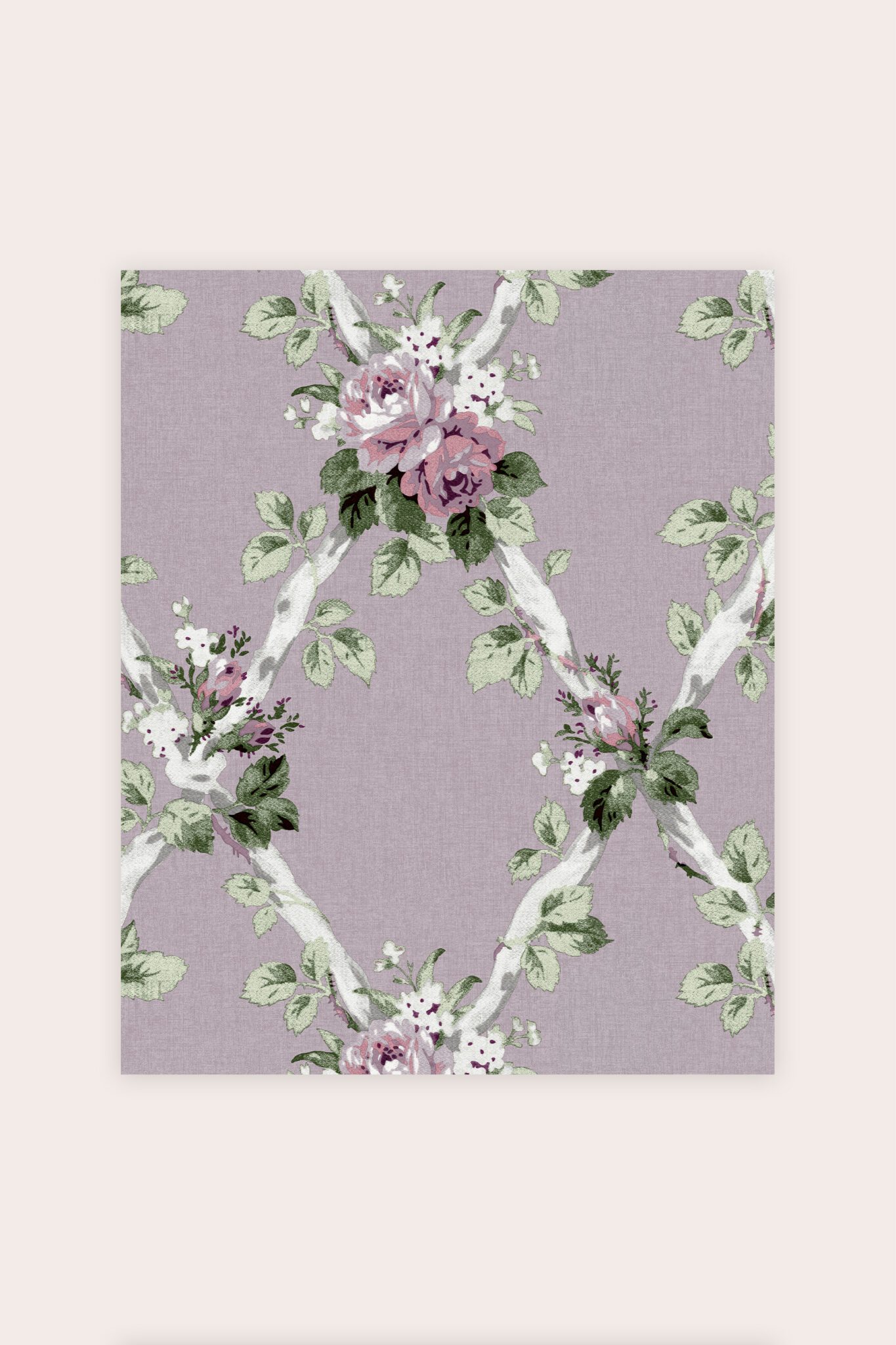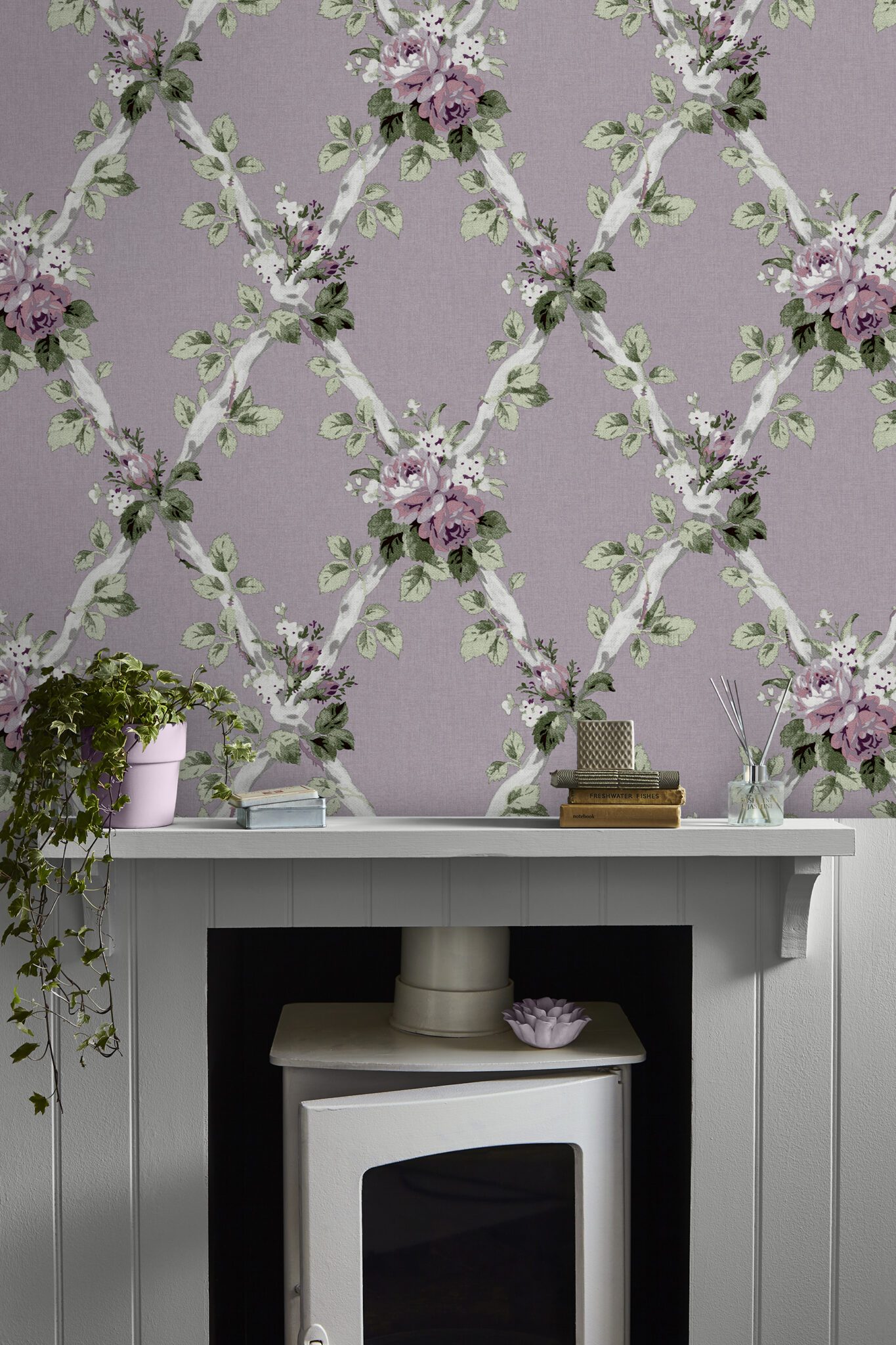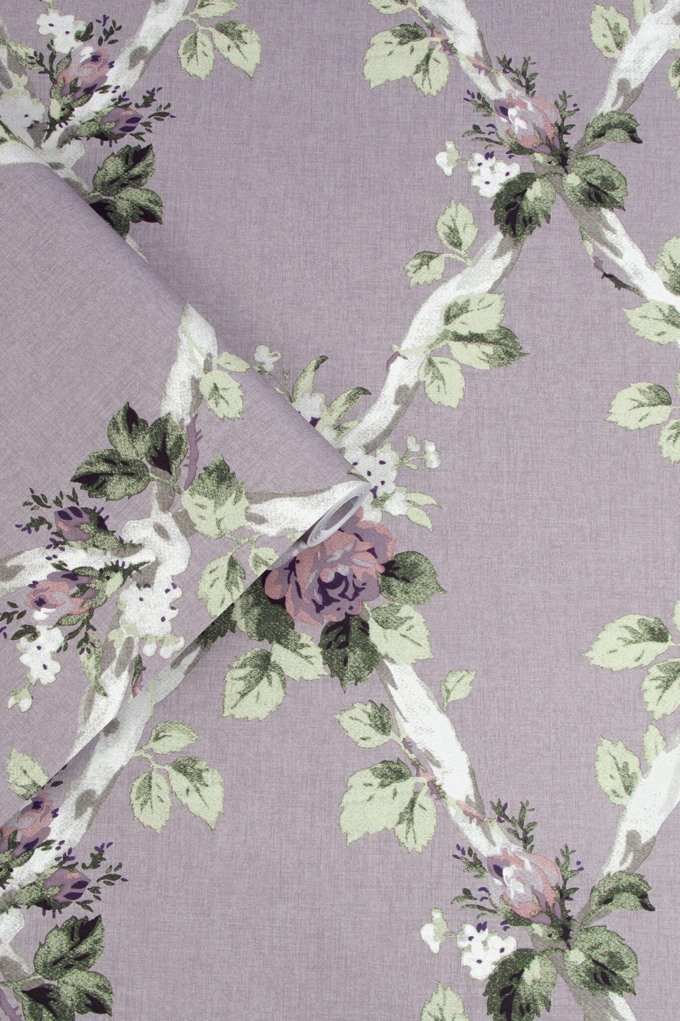Elwyn, rustikk og sjarmerende tapet med blomster i lilla, det lekre espalier mønsteret gir den et koselig preg, sjarmerende, søt, romantisk og landlig er ord som beskriver Elwyn.