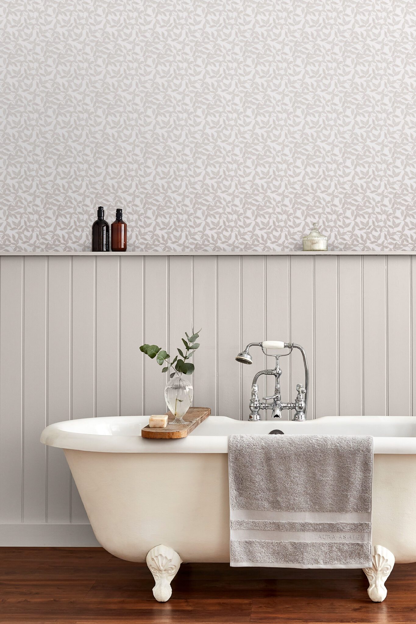 Erwood, sjarmerende og landlig tapet med ranker av blader som sprer seg over veggen, i en delikat duegrå som gir et sobert og rolig uttrykk.