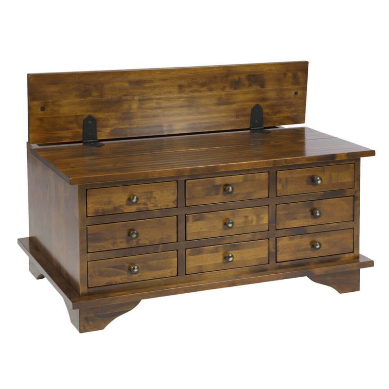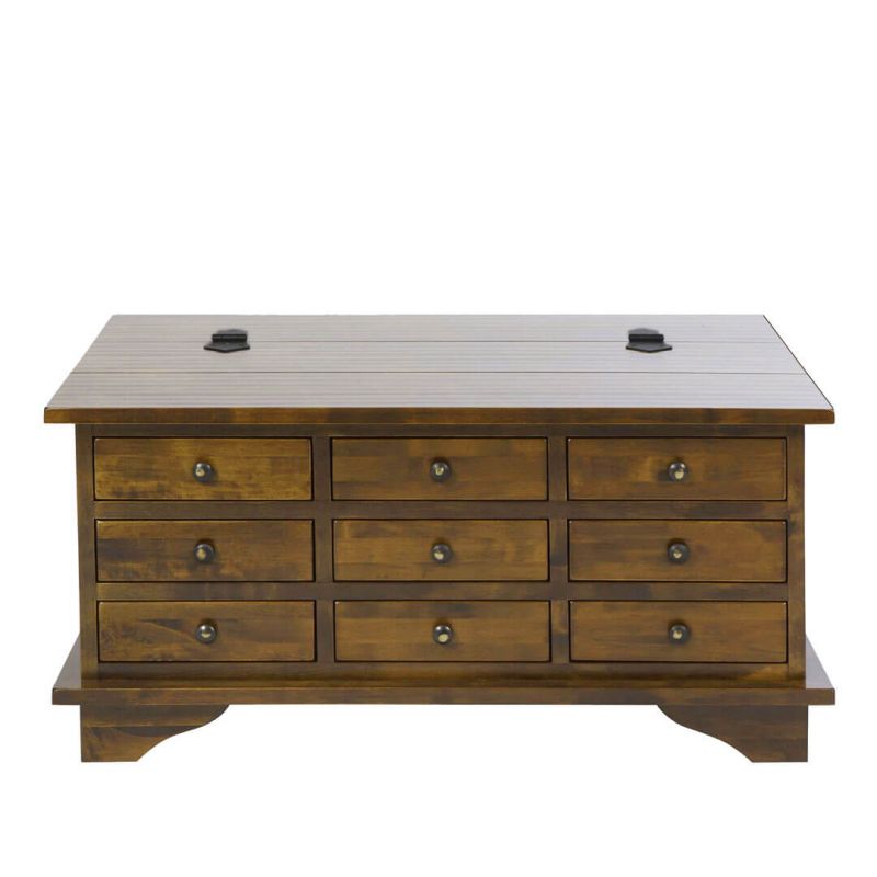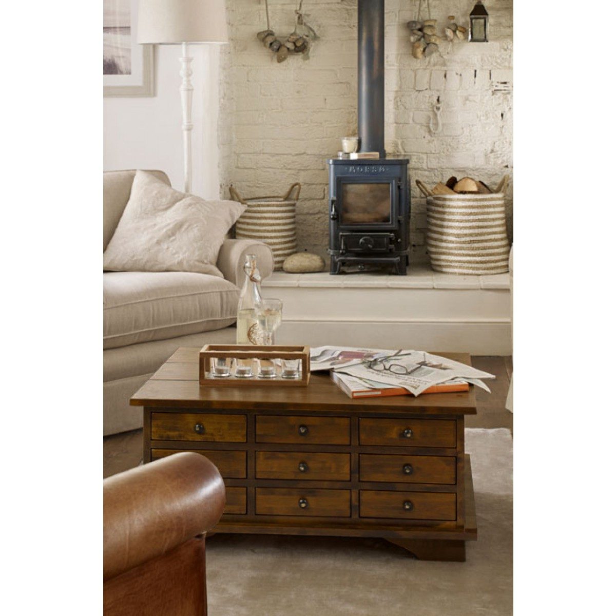 Crafted from predominantly solid birch but with some birch veneer modern materials the Laura Ashley Garrat nine drawer coffee table is a solid, well-proportioned occasional table and is strongly reminiscent of an old apothecary cabinet. It features a rippled lift-up lid and there are nine handy-sized drawers. The table is stained to enhance the natural wood effects and has brass effect fittings giving it a truly authentic look.