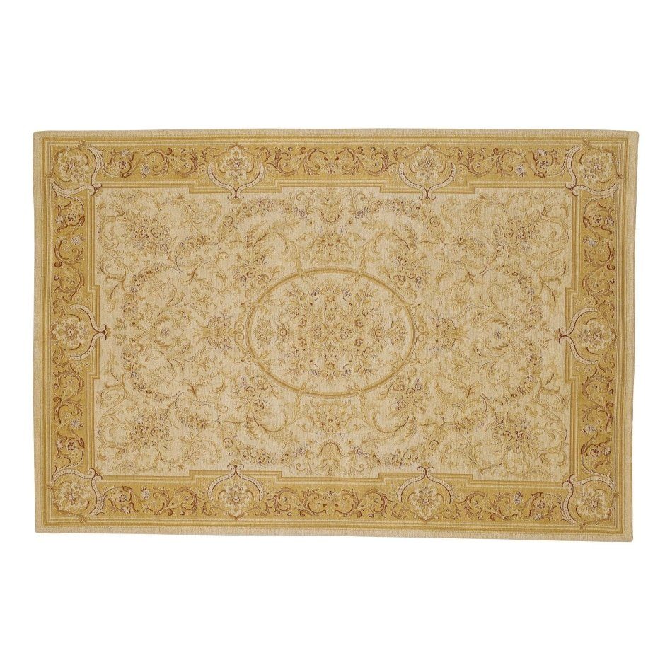 Et elegant gulvteppe i gull, tradisjonelt og klassisk mønster. Elfenben og varme gylne toner, med innslag av tranebærrødt som gir et eksklusivt preg