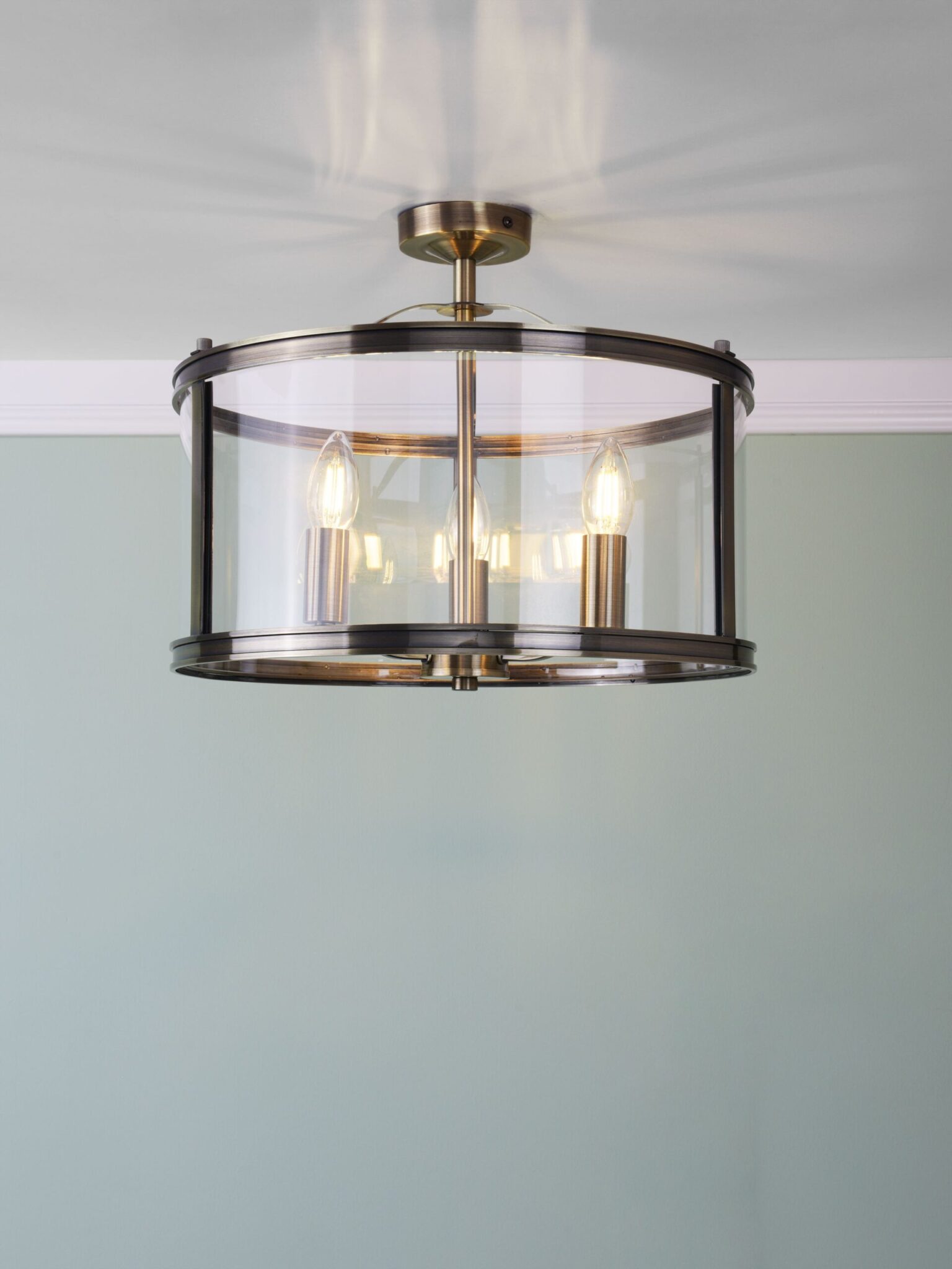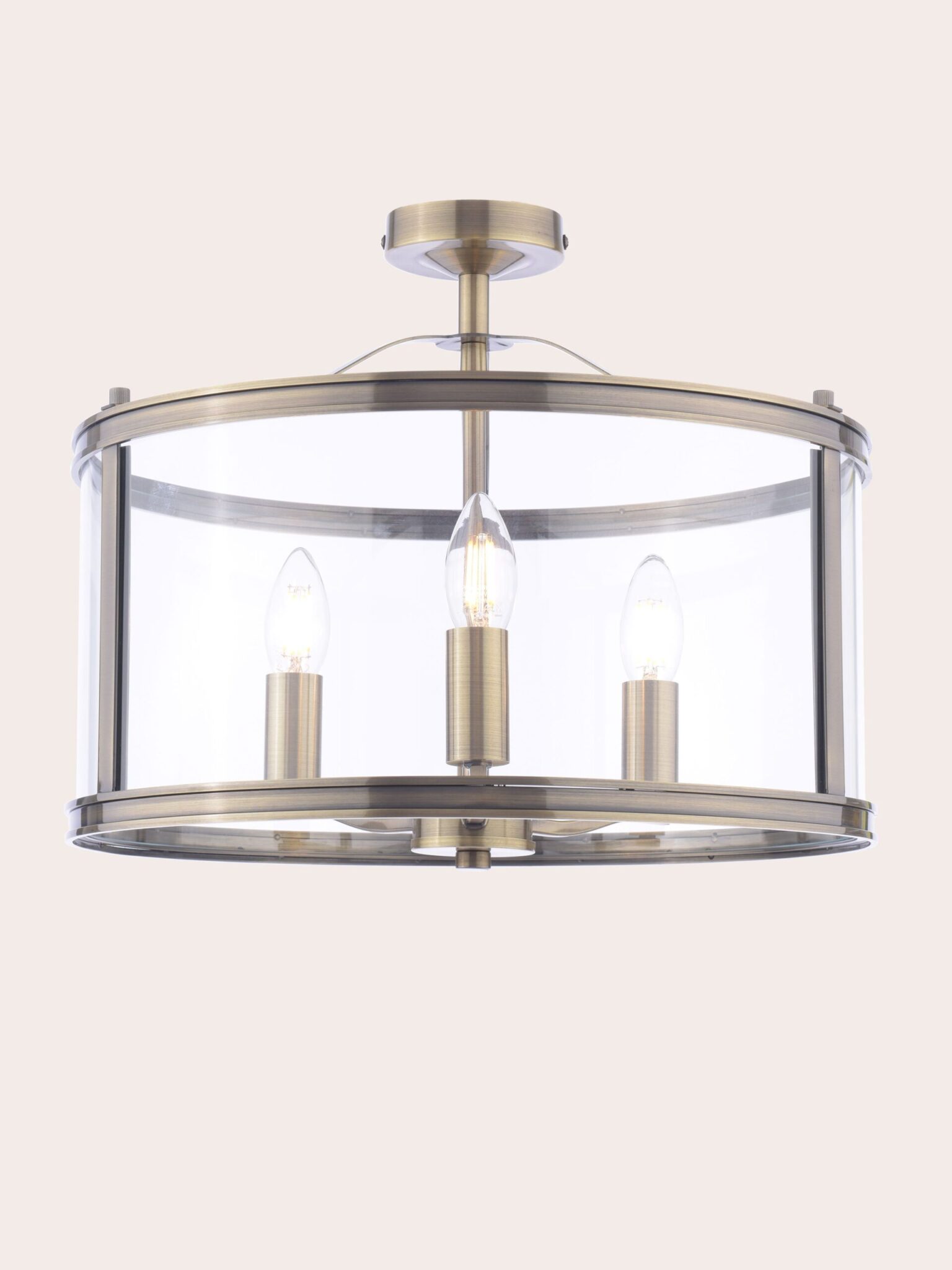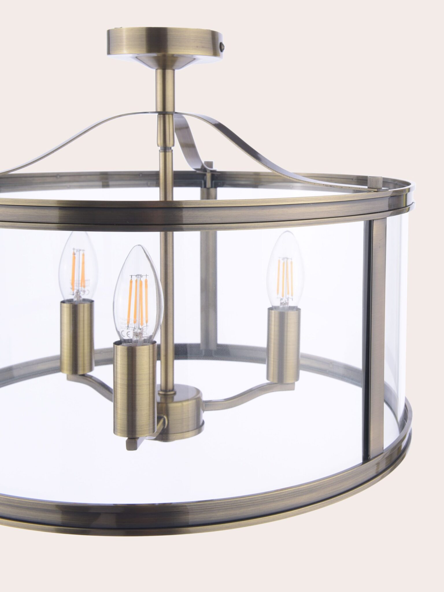Harrison, en tidløs og klassisk taklampe i antikk messing og glass, de rene linjene og enkelheten gir et elegant uttrykk. Med 3 lyspunkter inne i en bøtteformet skjerm av glass, får den en subtil eleganse som vil gi rommet et løft.