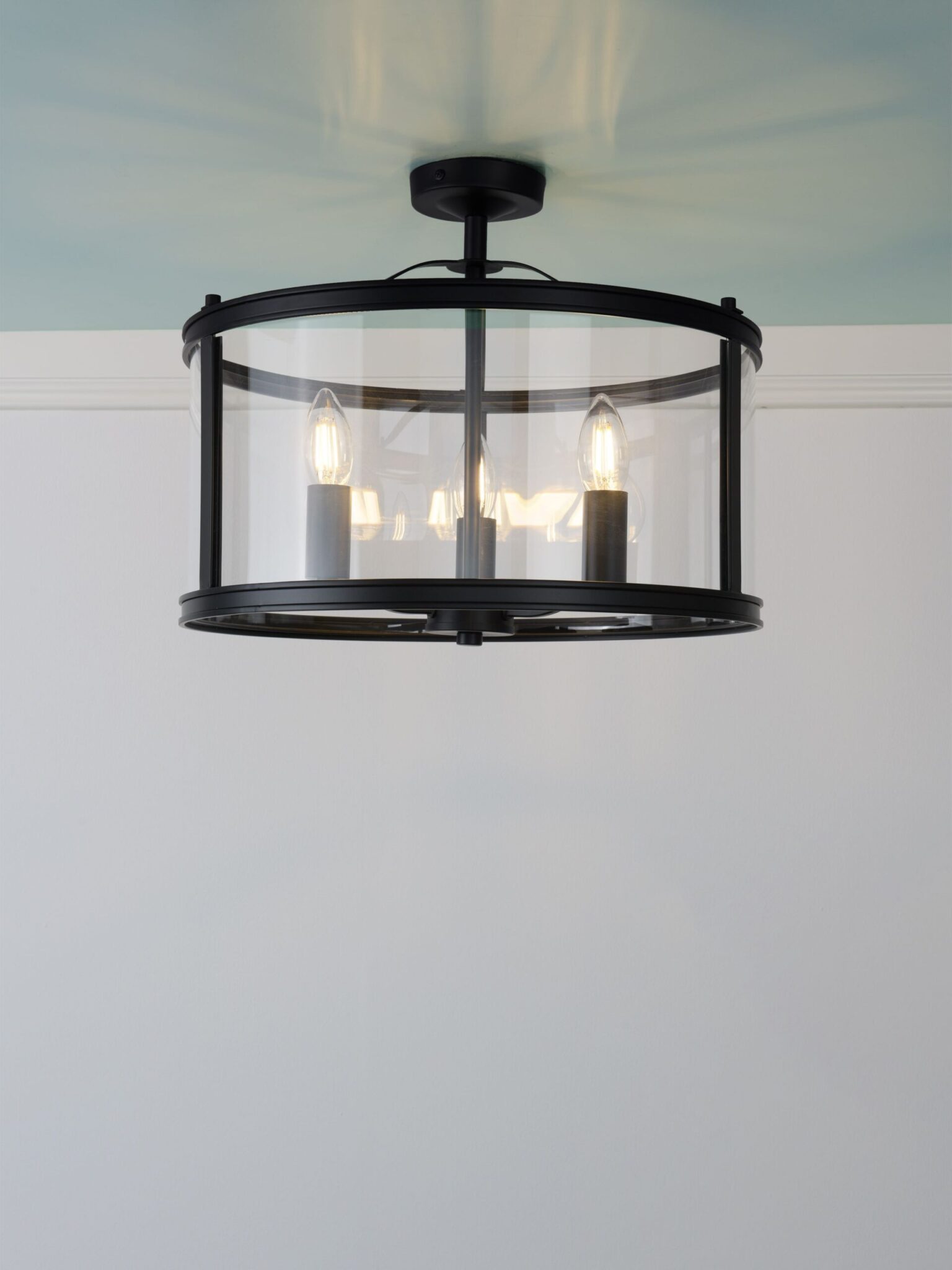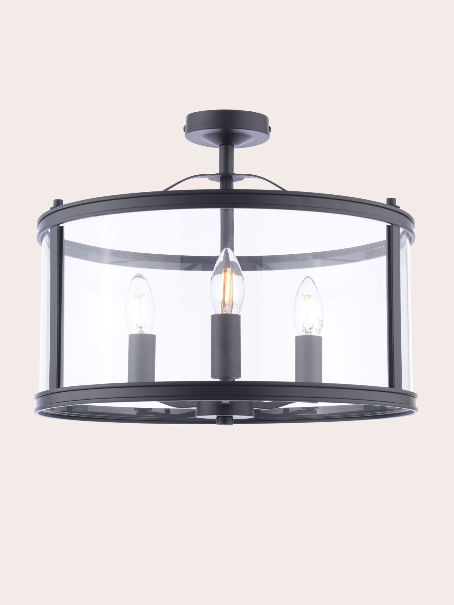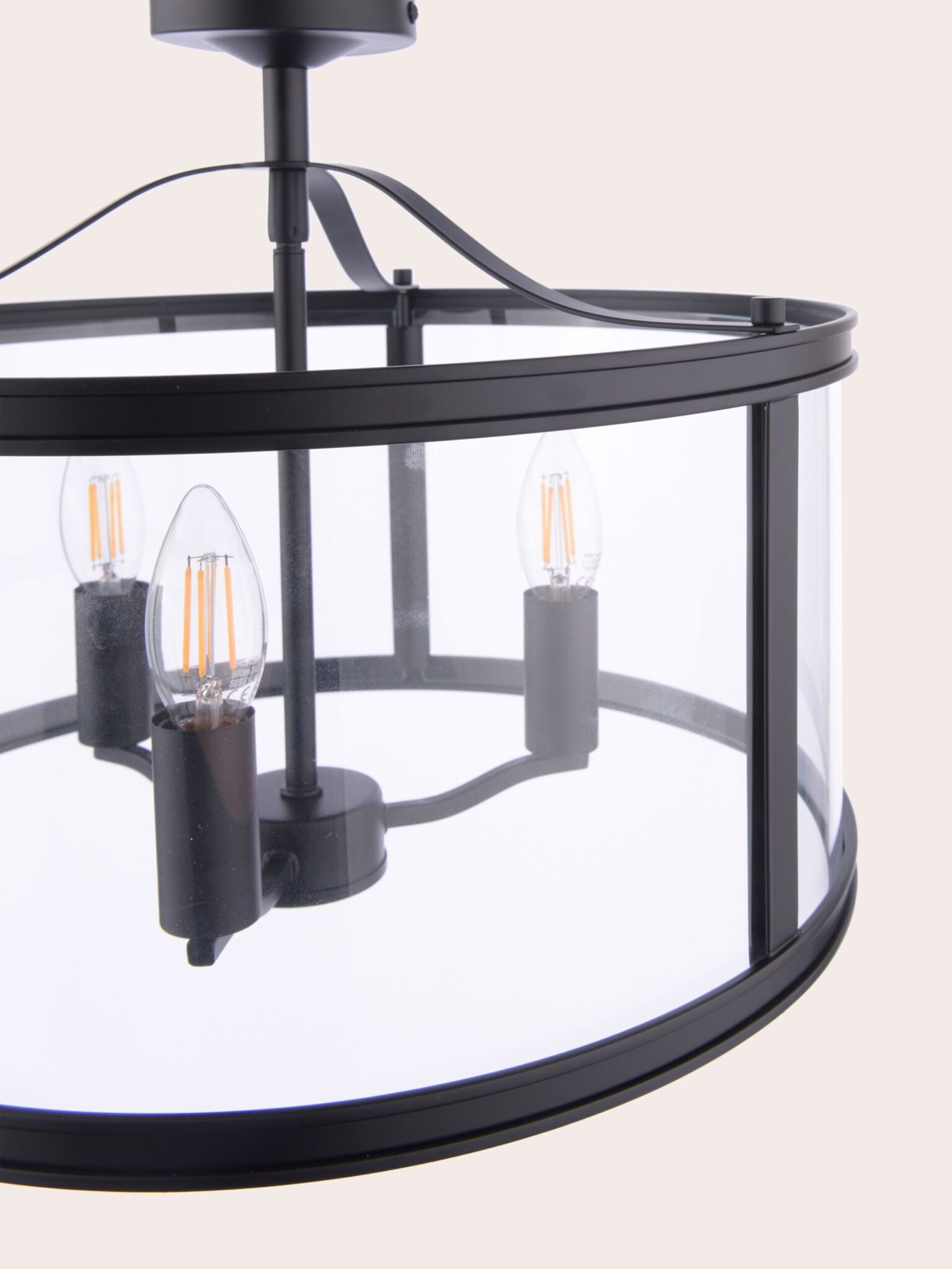 Harrison, en tidløs og klassisk taklampe i industriell sort og glass, de rene linjene og enkelheten gir et elegant uttrykk. Med 3 lyspunkter inne i en bøtteformet skjerm av glass, får den en subtil eleganse som vil gi rommet et løft.