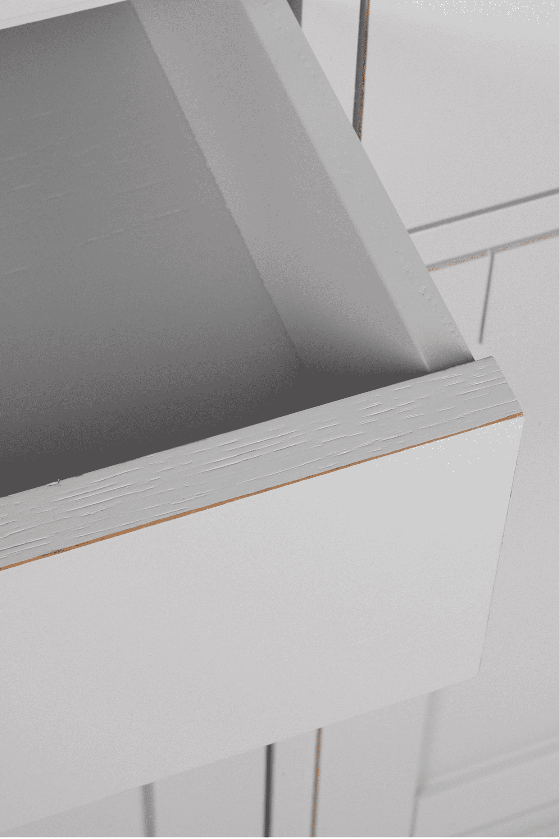 Henshaw, tidløs og elegant møbelserie fra Laura Ashley, i hovedsak heltre med noe finer er denne serien en solid og vakker møbelserie. Her en elegant og praktisk skjenk med to skuffer og skap med to flyttbare hyller for praktisk oppbevaring. Skjenken er håndmalt og med en lakkert overflate for enkelt vedlikehold. De lekre slitte kantene gir denne skjenken det lille ekstra.
