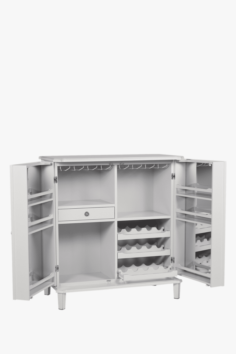 Henshaw, tidløs og elegant møbelserie fra Laura Ashley, i hovedsak heltre med noe finer er denne serien en solid og vakker møbelserie. Her et stilrent og elegant barskap i lys stålgrå. Barskapet har plass til 12 flasker, og annet som benyttes når man har gjester.