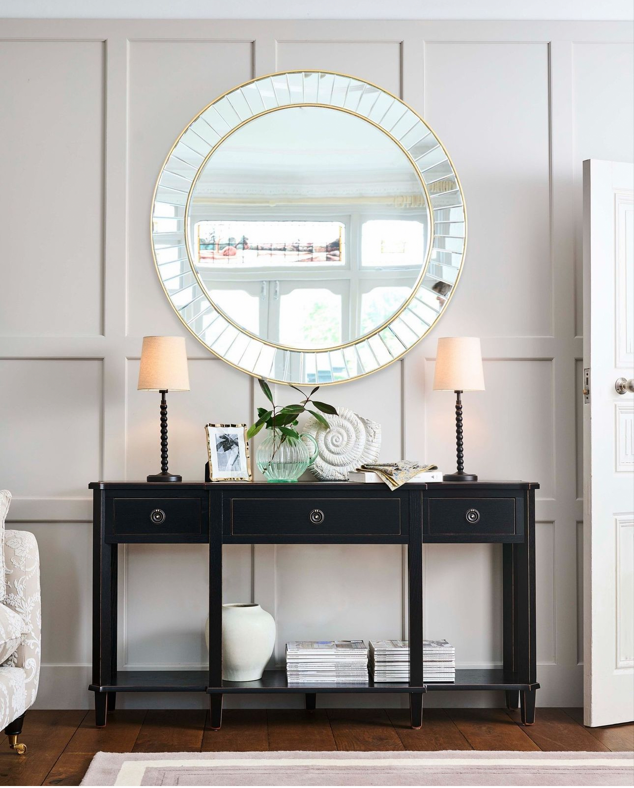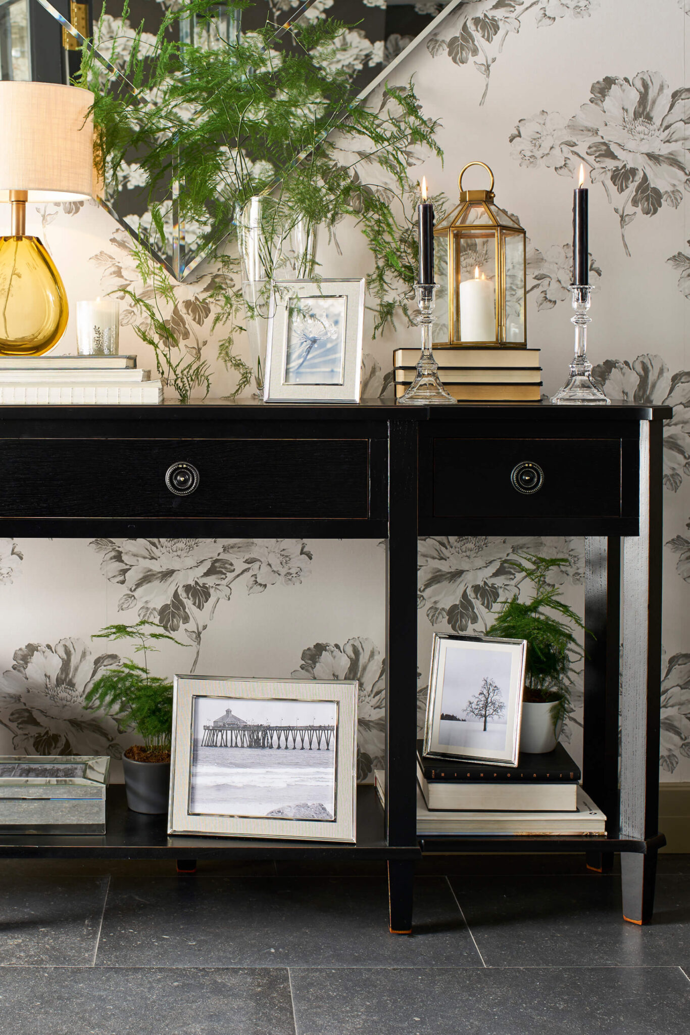 Henshaw, tidløs og elegant møbelserie fra Laura Ashley, i hovedsak heltre med noe finer er denne serien en solid og vakker møbelserie. Her et lekkert XL konsollbord med tre skuffer og hylle for praktisk oppbevaring. Konsollbordet er håndmalt og med en lakkert overflate for enkelt vedlikehold. De lekre slitte kantene gir dette konsollbordet det lille ekstra.