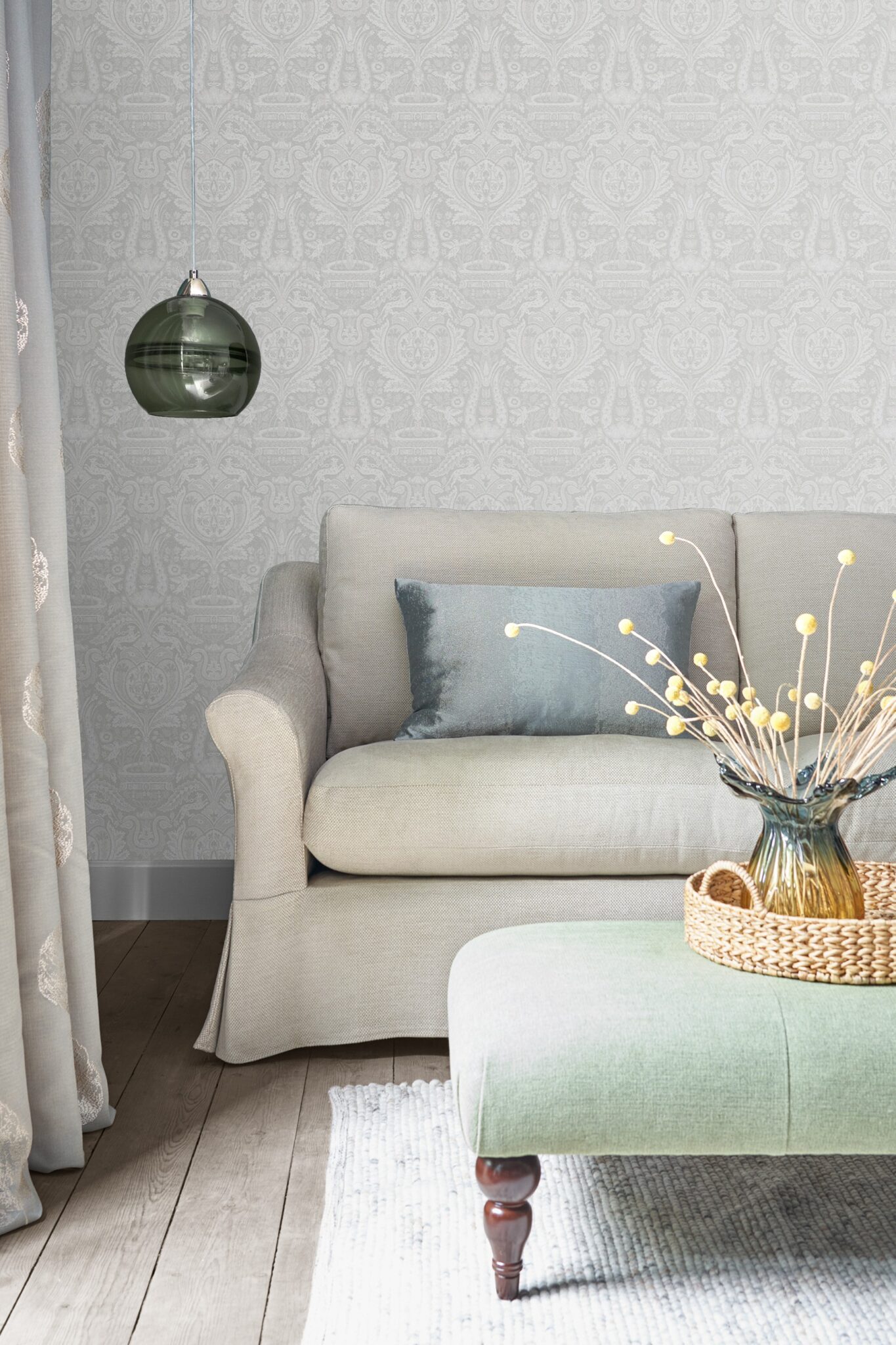 This beautiful Heraldic Damask design in slate grey tones will create the perfect backdrop for a regal interior.