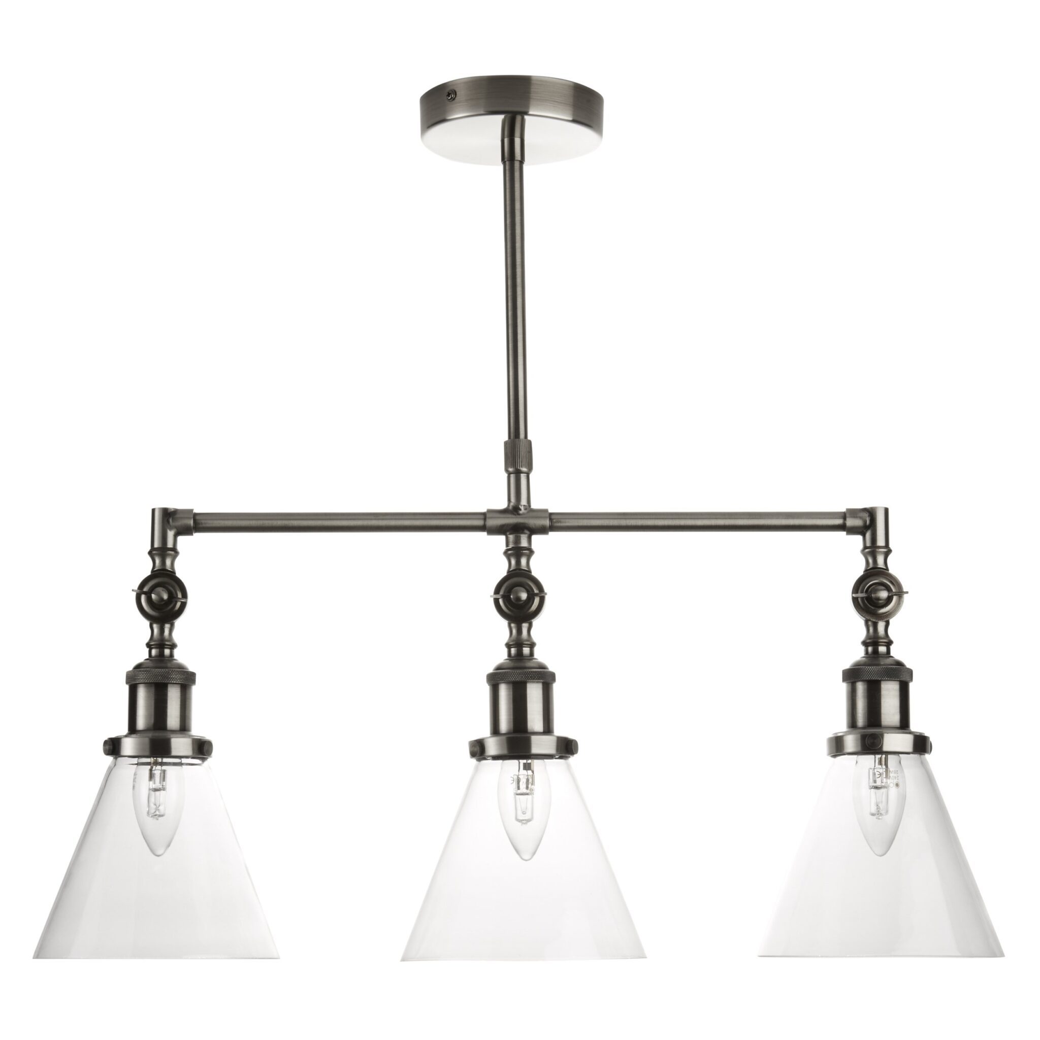 A modern classic, our Isaac three arm pendant light is a simple and elegant piece perfect for updating any room in your home. This contemporary light boasts a cool, industrial appeal in a brushed chrome finish and three glass shades allowing it to work seamlessly with any number of interior styles. The Height of this pendant is adjustable.