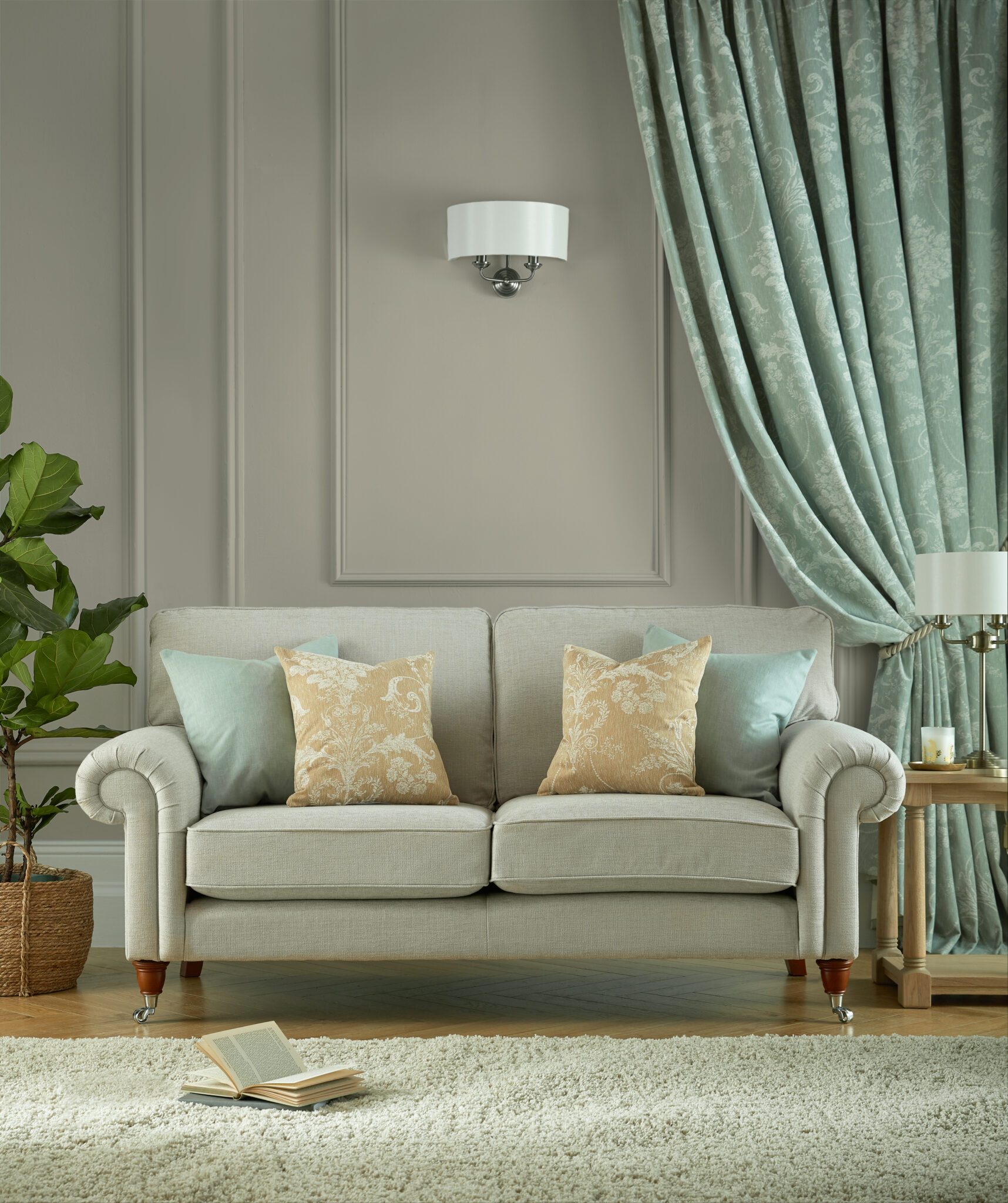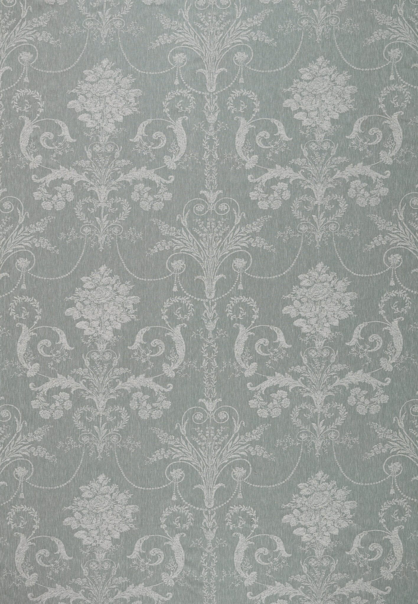 Vårt lekre damaskmønster Josette, her som mønster i et damaskvevet gardinstoff i grågrønn, mønsteret er inspirert av en antikk fransk toile. Mønster og damaskvevingen gir det et sofistikert, elegant og eksklusivt uttrykk