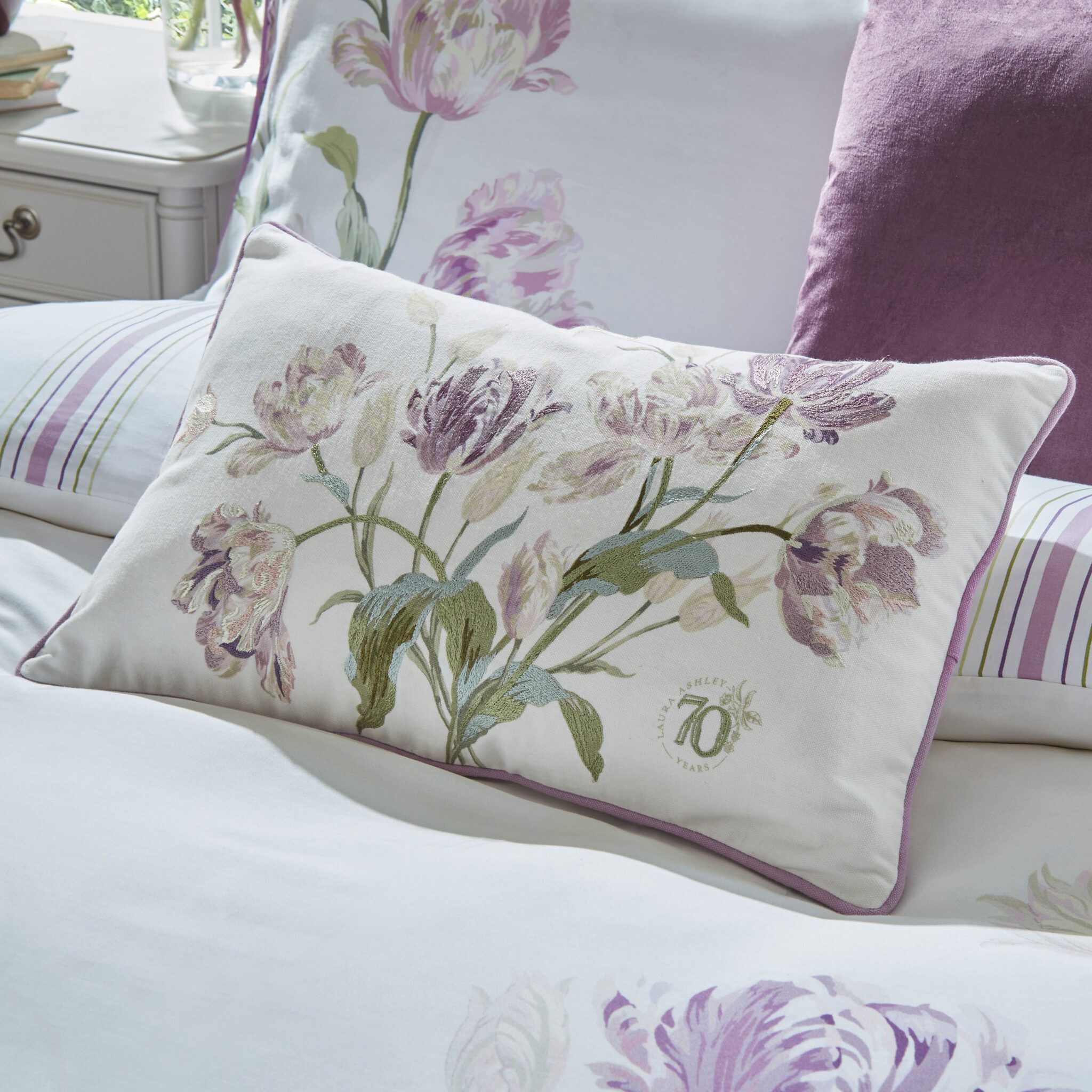 Vi feirer 70 år, elegant pute med broderte tulipaner og vår 70års logo trykket. En pute som vil gi glede og live opp rommet, og som er en del av vår arv.