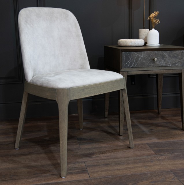 Kaya spisestol kombinerer moderne eleganse med komfort i en raffinert og tidløs design. Setet er trukket i myk, kremfarget velur som gir en lun og eksklusiv sitteopplevelse – perfekt for lange middager og hyggelige sammenkomster.