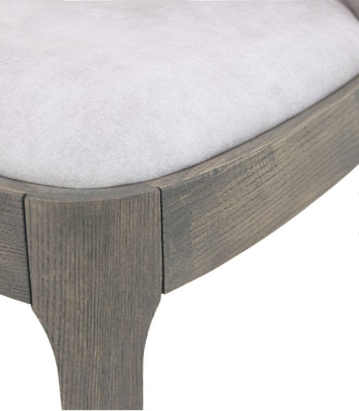 Den beisede rammen i ask skaper en vakker kontrast til det lyse tekstilet. Treverkets naturlige struktur og subtile årringer fremhever stolens rene linjer og minimalistiske uttrykk, samtidig som det tilfører varme og karakter.