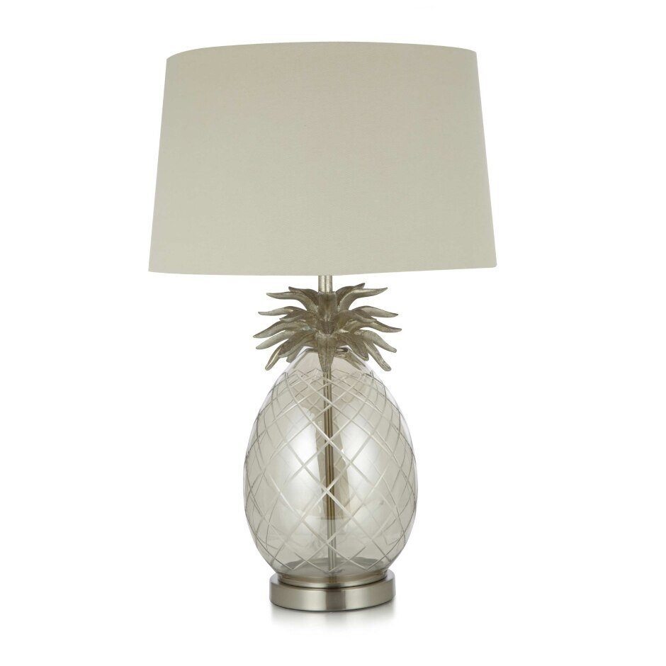 Vår lekre ananslampe, her i glass, komplett med skjerm i kaffelattefarget stoff. Det er en elegant champagnefarget lampe i glass, med lekre detaljer. Denne lampen kommer også som pendellampe, i en (s) utgave og som vegglampe. Vi har også en ananaslampe som er med massiv ananasformet fot. Så her har du mange muligheter til å tilføre litt tropisk eleganse til hjemmet.