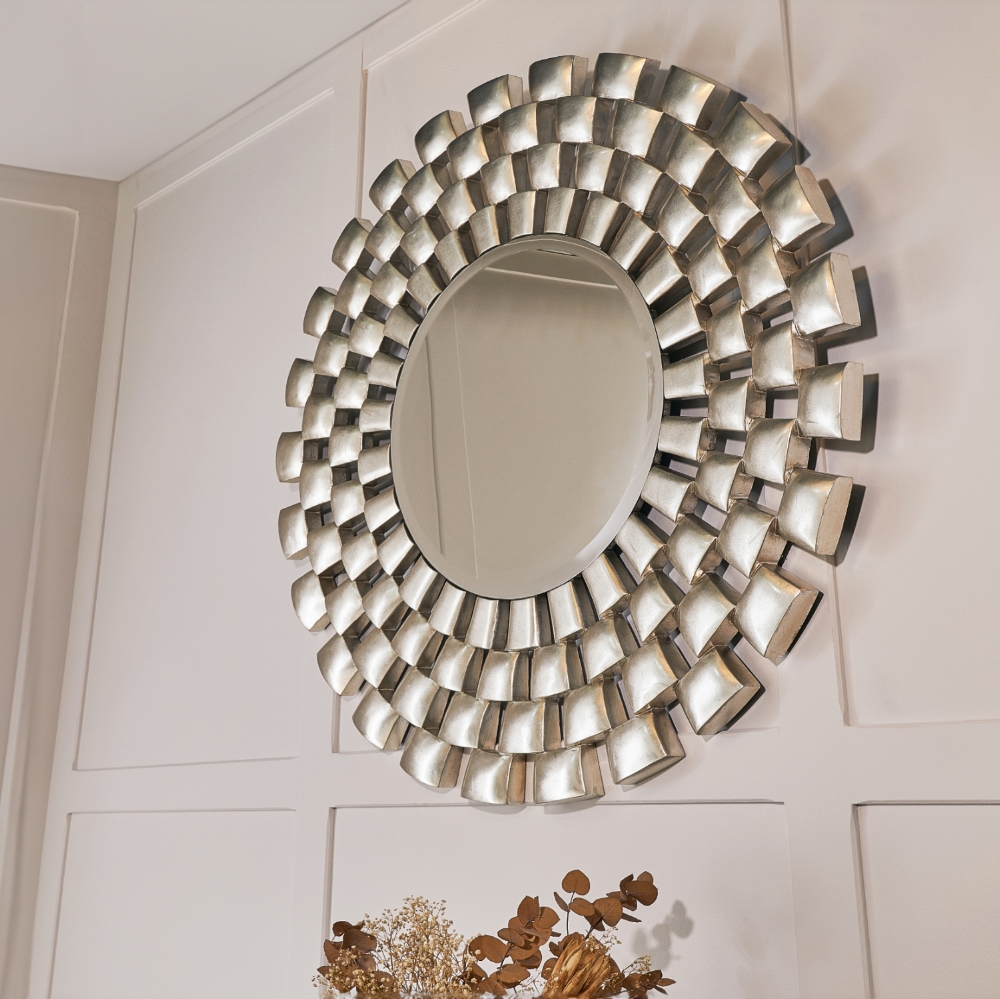 Den dekorative rammen med håndpåført sølvfinish tilfører rommet en sofistikert glød og reflekterer lyset på en myk og stemningsfull måte.