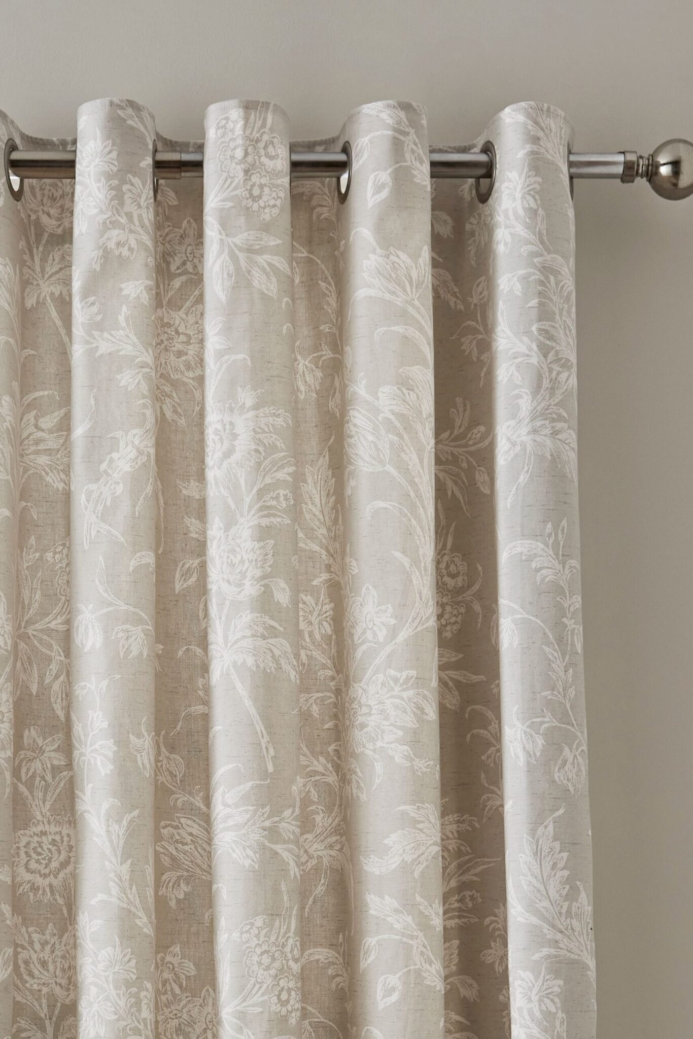 Lloyd, lekre ferdigsydde gardiner fra Laura Ashley i et delikat floralt mønster i duegrått. Dette er en tidløs klassiker fra Laura Ashley sitt arkiv Ferdigsydde gardiner med maljer og bomullsfor.