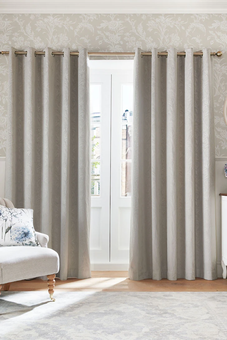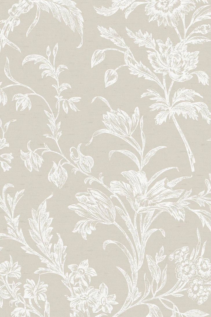 Dove Grey Lloyd-trykket er tidløst elegant og er en storstilt vevd floral jacquard-design med romantisk buede blomsterstengler av tulipaner, primulaer og potentillaer.