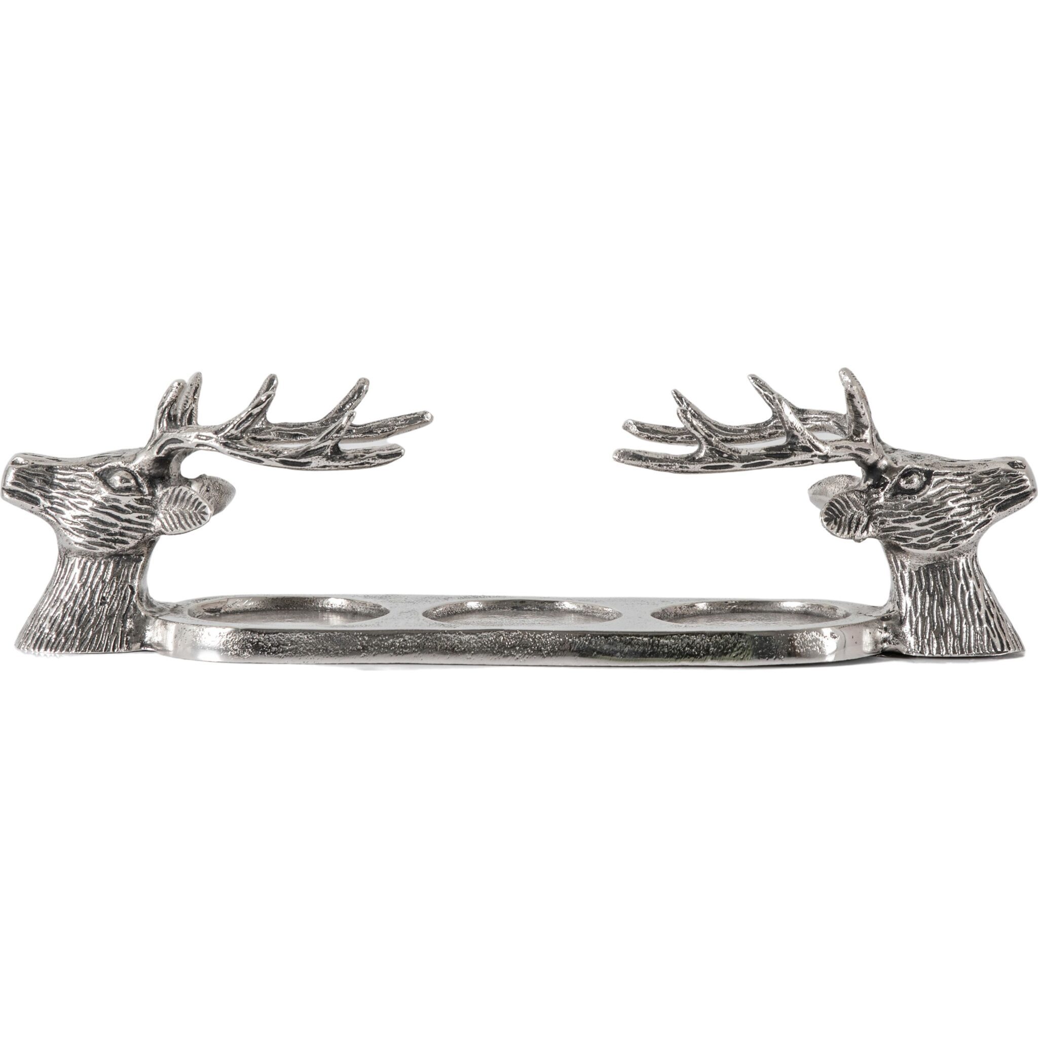 Centre piece or as a decorative ornament for a sideboard, this candle holder features a stunning aluminium stags. Perfect to light up any room.
