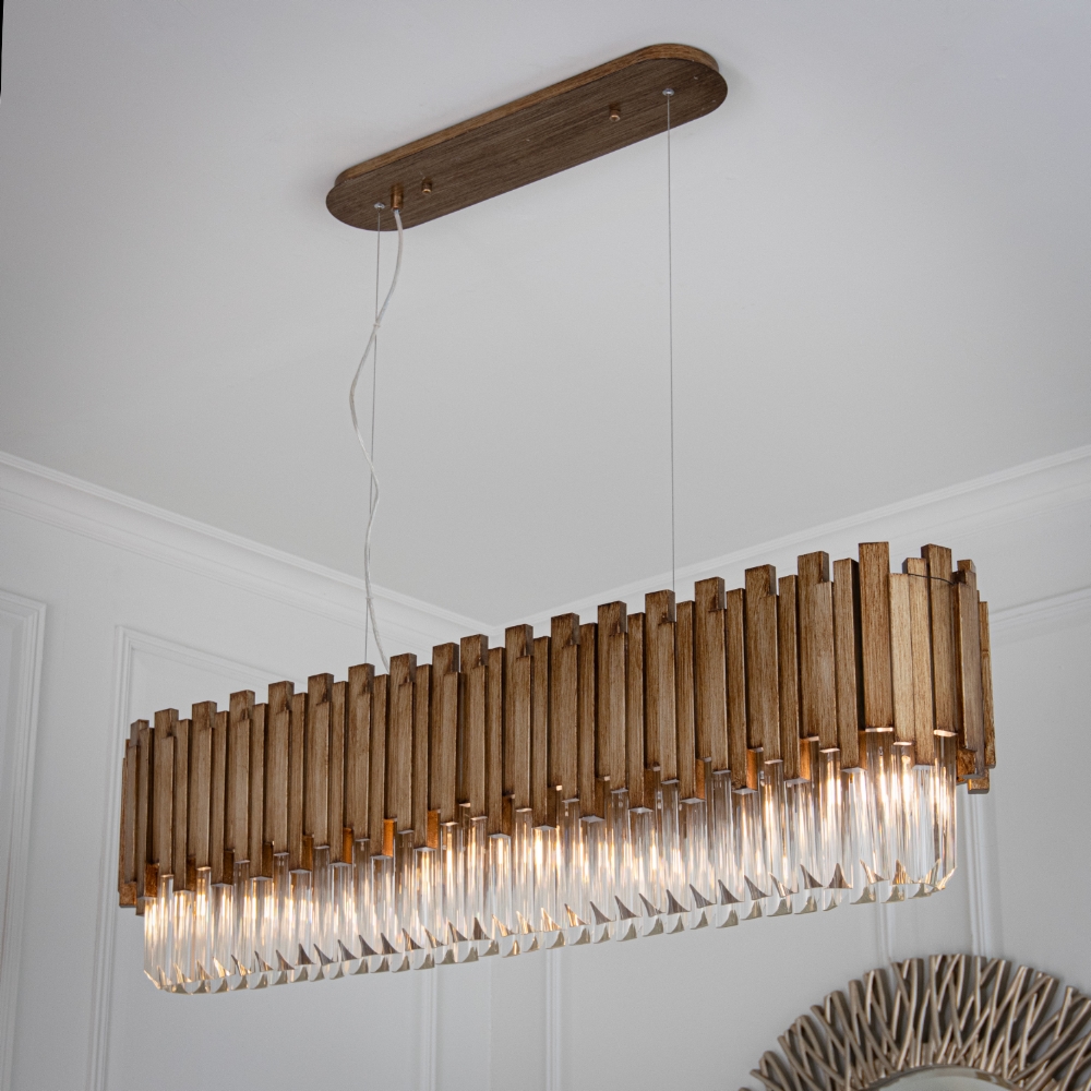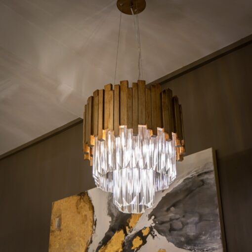 Maive pendellampe kombinerer klassisk eleganse med moderne, kunstnerisk design. Lampen har et øvre lag med strøkne gullstenger plassert i ulike høyder, som skaper et iøynefallende og skulpturelt uttrykk. Den antikke gullfinishen gir en varm og luksuriøs glød, og gjør lampen perfekt som blikkfang i entré, stue eller over spisebord.